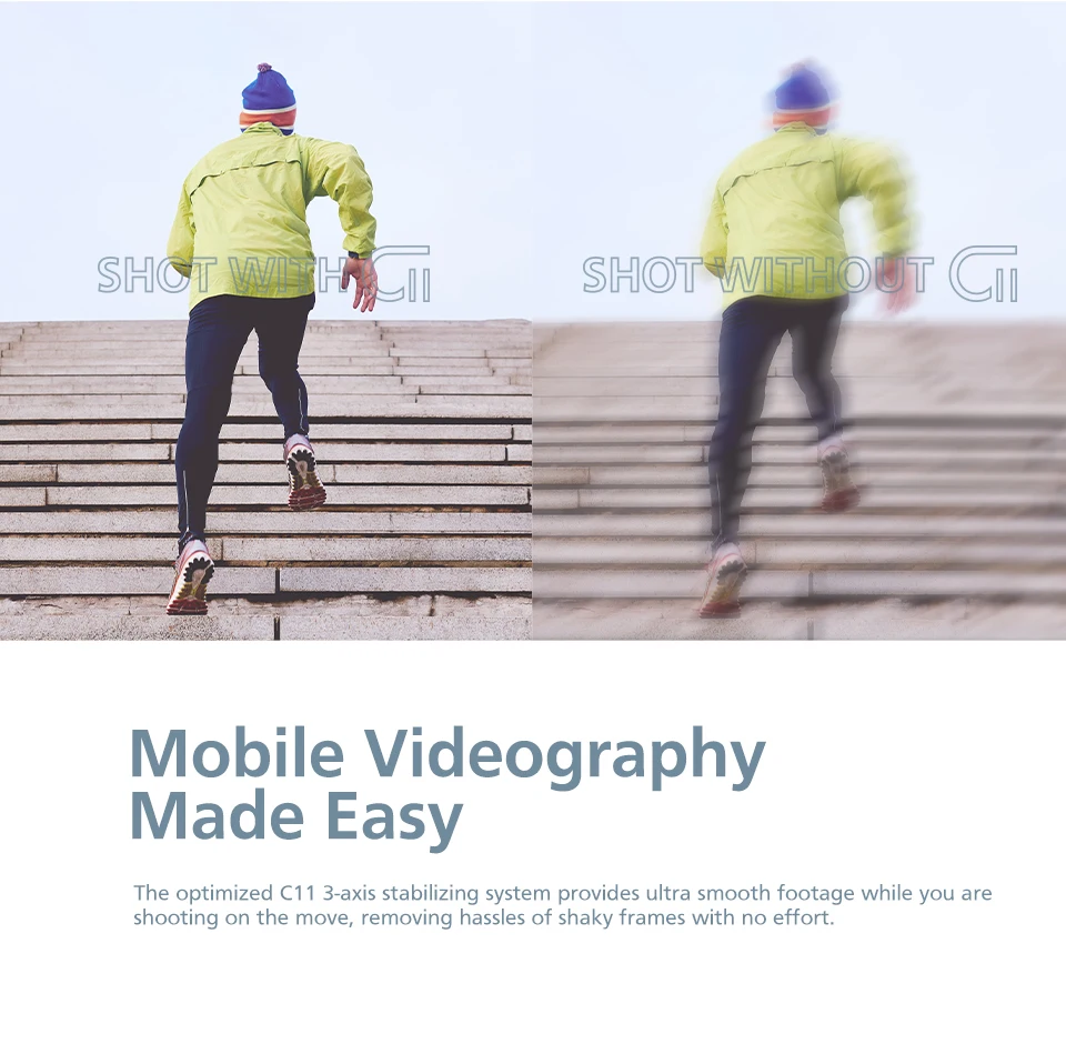 Оптимизированный 3-осевая стабилизация системы C11 легко устраняет шаткое кадров, обеспечивая шелковистые гладкая запись, когда вы находитесь,
