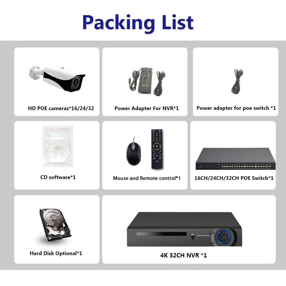 1 сетевой видеорегистратор 32CH 4K NVR;16/24/32 x HD 5.0MP POE IP Крытый Открытый ИК День ночного видения атмосферостойкие камеры;1x16/ 24CH/32CH POE переключатель1x источник питания для POE Switch1 x Блок питания для NVR;1 х USB мышь для NVR;1 компакт-диск программного обеспечения для NVR;1 пульт дистанционного управления для NVR;Жесткий диск опционально!