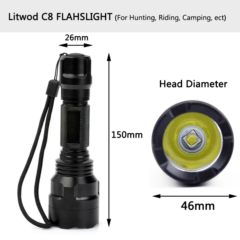 Название модели: C8Тип эмиттера: CREE XP-E Q5 / XM-L T6 / XM-L2 U3Яркость: 3000 люменКоличество ламп: светильник; Цвет: белыйСветодиодный срок службы: 100000 часовРежимы: 5 режимов (High - Medium - Low - Strobe - SOS)Максимальное расстояние освещения: 100-200 мКонфигурация батареи: 1x 18650 аккумуляторВход Напряжение: 3,6 V-4,2 VВремя работы: 2-4 часаТип переключателя: Clicky/ClickieРасположение переключателя: Хвостовая крышкаЛинзы: плоские стеклянные линзыМатериал: алюминиевый сплавВодонепроницаемость: IPX6 (под водой 1 м, использование в дождливый день, нельзя нырять)Цвет: черный