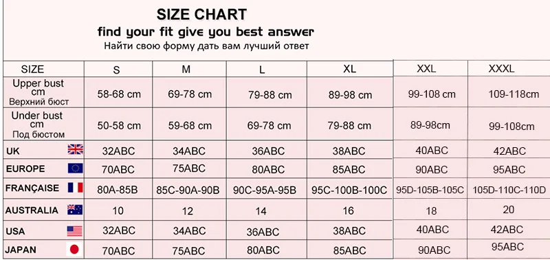 Информация о размере:S:Верхний бюст: 58-68 см, под грудью (см): 50-58 см, подходит для 30C / 32AB =(65C / 70AB)М:Верхний бюст: 69-78 см, под грудью (см): 59-68 см, подходит для 32C / 34ABC =(70C / 75ABC)L:Верхний бюст: 79-88 см, под грудью (см): 69-78 см, подходит для 36ABC =(80ABC)XL:Верхний бюст: 89-98 см, под грудью (см): 79-88 см, подходит для 36C / 38AB =(80C / 85AB)XXL:Верхний бюст: 99-108 см, под грудью (см): 89-98 см, подходит для 38C / 40ABC =(85C / 90ABC)XXXL:Верхний бюст: 109-118 см, под грудью (см): 99-108 см, подходит для 40C / 42AB =(90C / 95AB)Примечание:У нас также есть подходящиеСоблазнительные трусики из кружева. Если он вам нужен, перейдите по этой ссылке: Https://www.aliexpress.com/item/1005001860208764.html,Информация о размере: