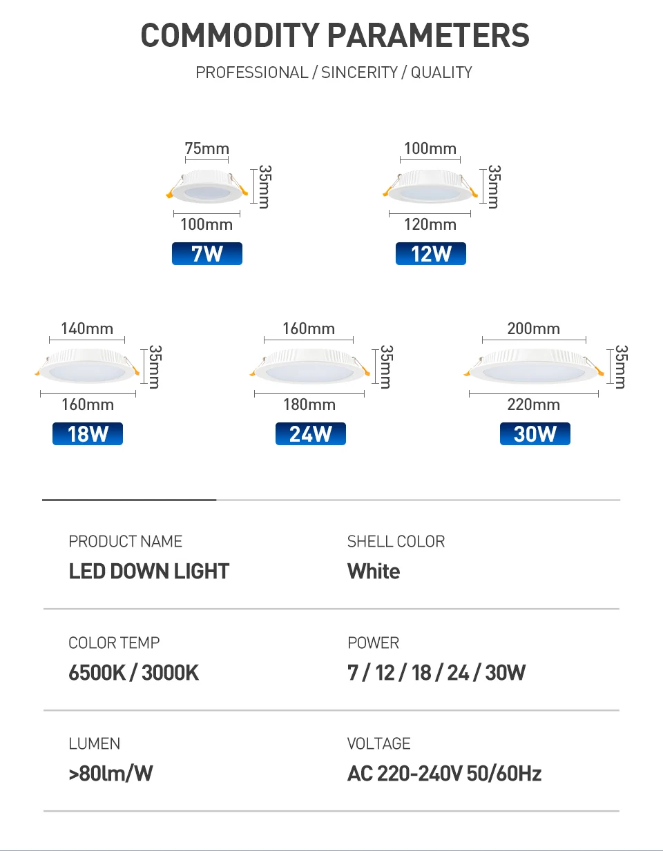 Напряжение: AC220-240V Форма: круглая Мощность: 7 Вт 12 Вт 18 Вт 24 Вт 30 Вт Цветовая температура: холодный белый/теплый белый Характеристики: Простота установки/высокая яркость