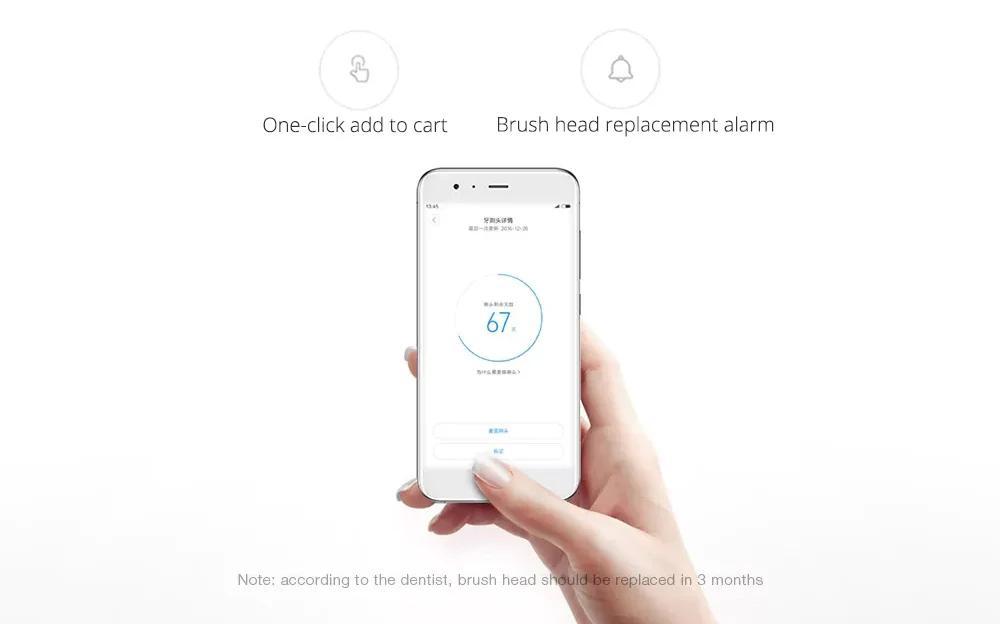 Всегда забудьте заменить головку кисти? Не волнуйтесь, Mijia хорошо решает проблему для вас. Легко проверить оставшийся lfe промежуток вашей головки кисти (это будет обратный отсчет от 90 дней), и вы также можете приобрести новую головку кисти, просто нажав на приложение, больше экономии времени. Примечание: Согласно стоматологу, головка щетки должна быть заменена в течение 3 месяцев.
