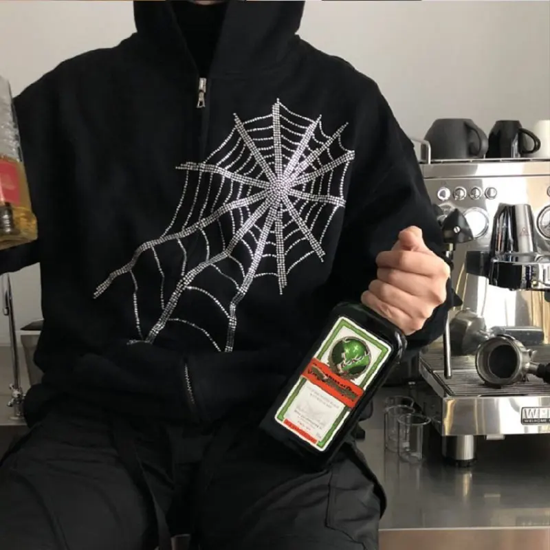 Мужская толстовка на молнии, черная толстовка с капюшоном в стиле Харадзюку, в готическом стиле, с изображением паутины, эмо, альт, феи, гранж, 2021