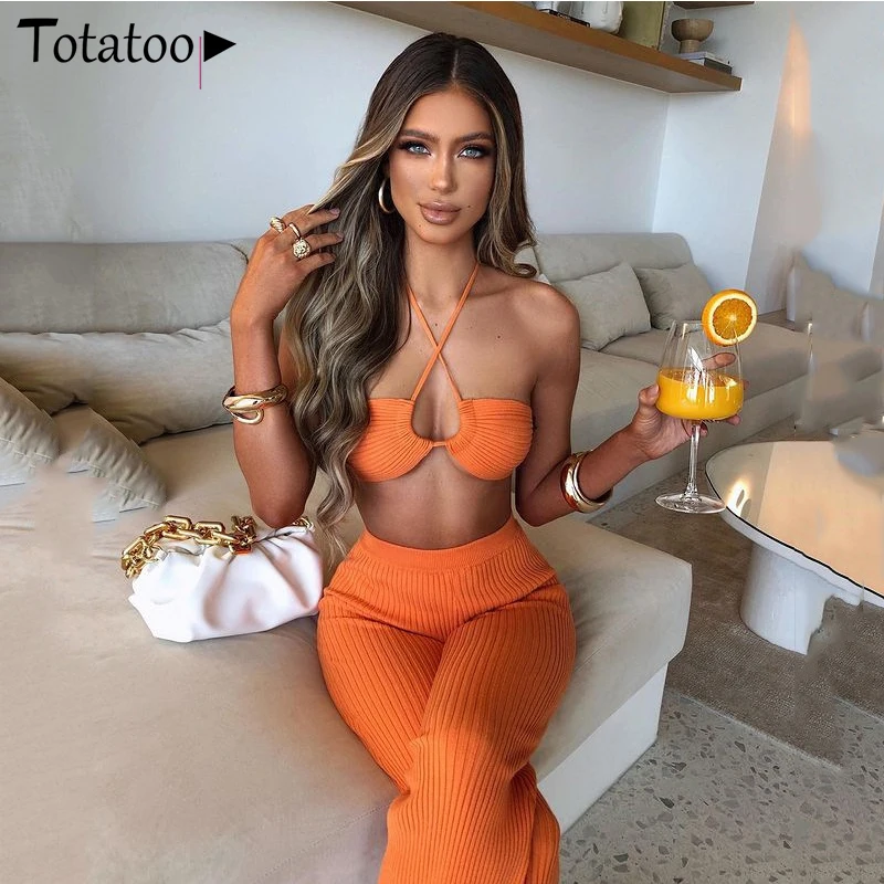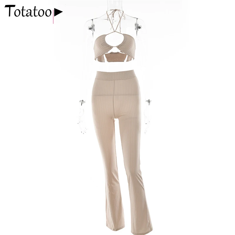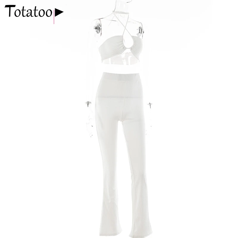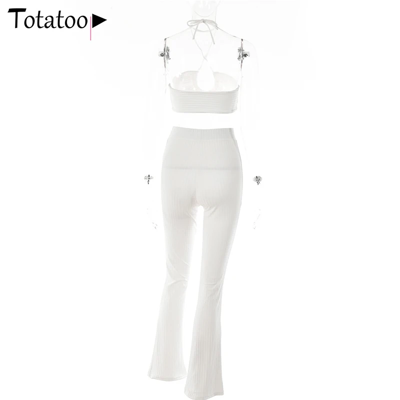 Женский комплект из двух предметов Totatoop, белый вязаный Топ в рубчик с открытой спиной и длинные штаны, элегантный летний костюм