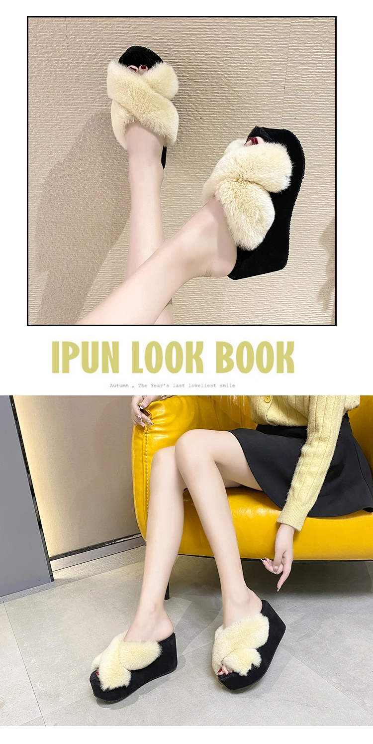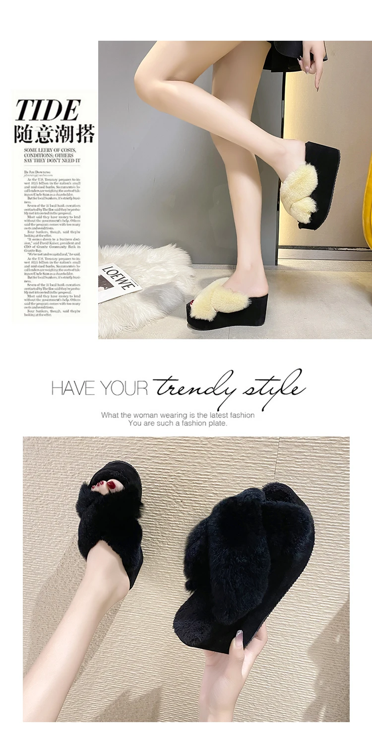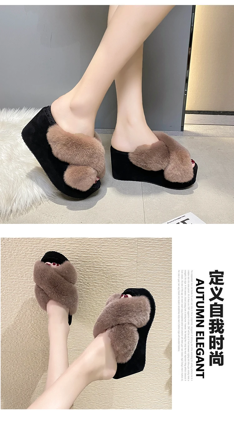 Женские меховые шлепанцы, искусственный мех, танкетка, каблук, платформа, зимняя обувь, пушистые тапочки