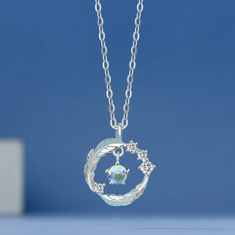 Ожерелье VOQ из стерлингового серебра 925 пробы с круглым цветным лунным камнем и перьями для женщин модная цепочка до ключиц ювелирные изделия для вечеринки