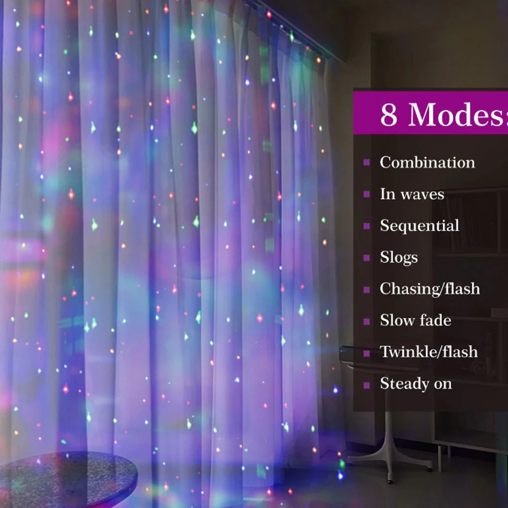【8 светильник ing режима】 3x3 м 300 светодиодный светильник шторы строка светильник имеет 8 светильник ing режимов: Комбинация, волны, последовательно, медленное мерцание, поочередное мерцание/мигание, медленное затемнение, мерцание/вспышка, устойчивый.