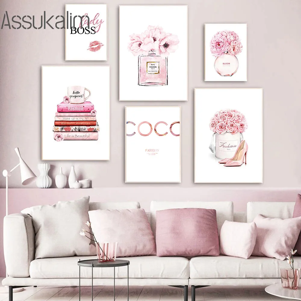 Флакон духов, печать на холсте, модный постер, картина с розовыми ц...