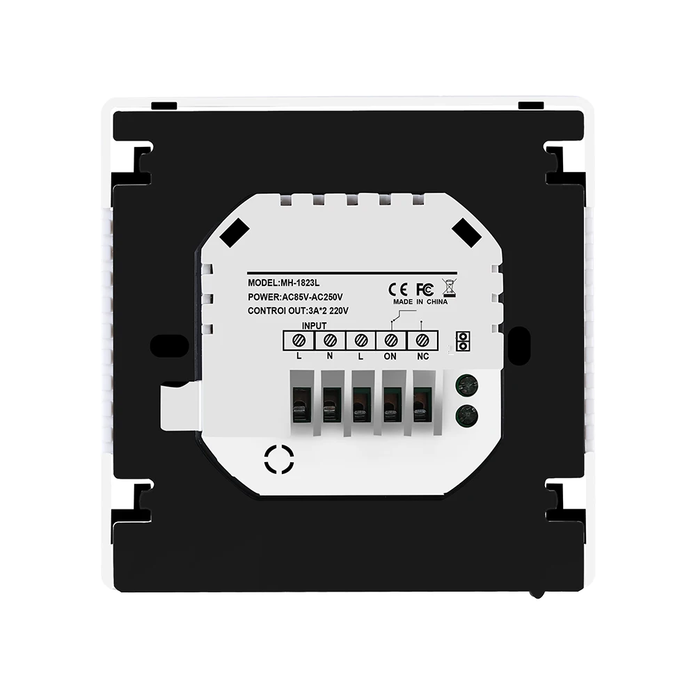 -Питание: AC85V-265V 50/60Hz-Диапазон температур: 5-50 ℃/41-99 ℉-Лимит температуры. Диапазон: 5-65 ℃ (по умолчанию 35 ℃)-Точность: ± 0,5 ℃-Односторонняя разница в возврате: 1 °C ~ 9 °C (по умолчанию 1 °C)-Датчик: NTC 10K-Потребляемая мощность: < 2 Вт-Материал корпуса: поликарбонат + АБС (огнестойкий)-Расстояние установки отверстия: 60 мм (подходит для стандартной европейской круглой монтажной коробки).-Размеры: 86x86x43мм