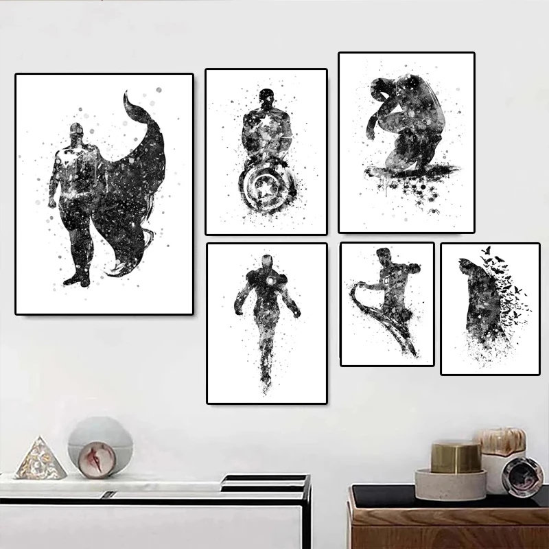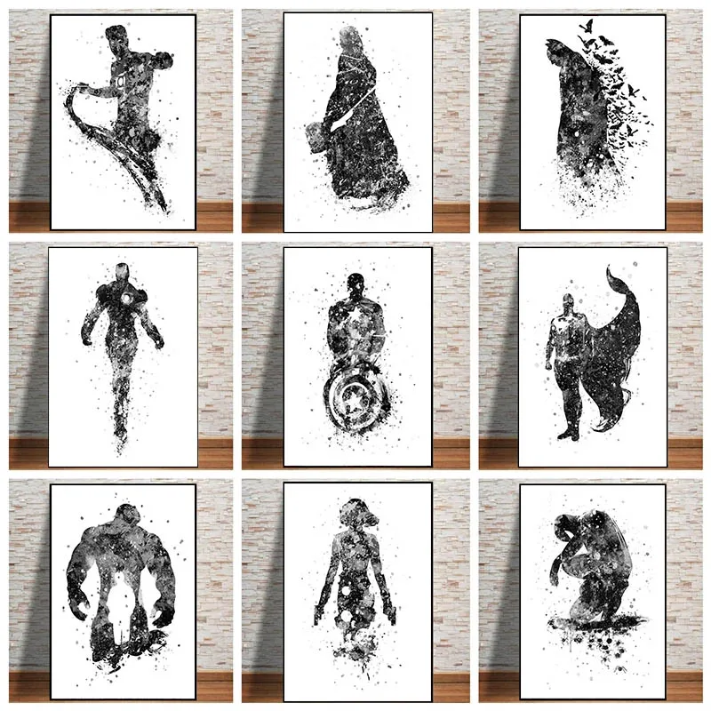 Постеры из аниме мстители Марвел, Картина на холсте с изображением Железного человека, Халка, супергероя, Настенная картина с черно-белым принтом для домашнего декора
