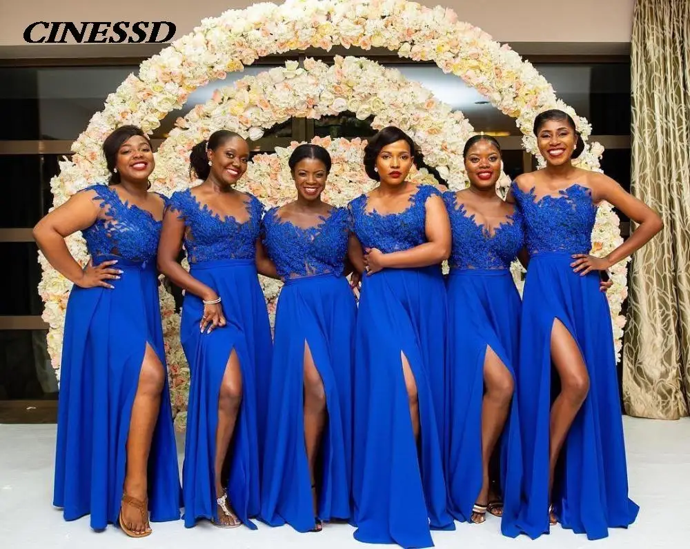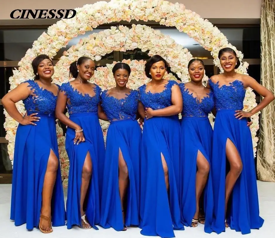 2021 кружевные платья для подружки невесты, длинное женское платье ярко-синего цвета с вырезом и аппликацией для выпусквечерние вечера