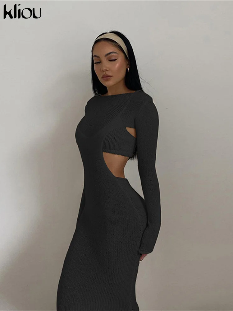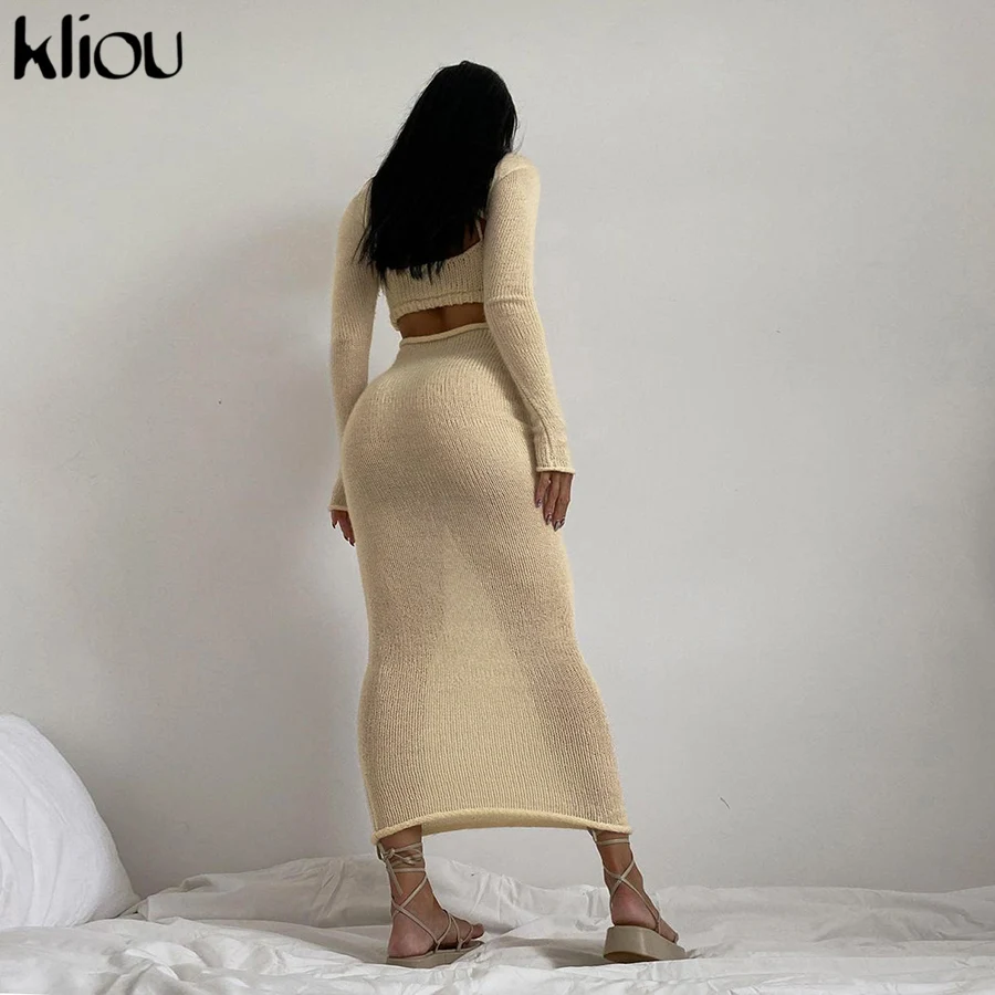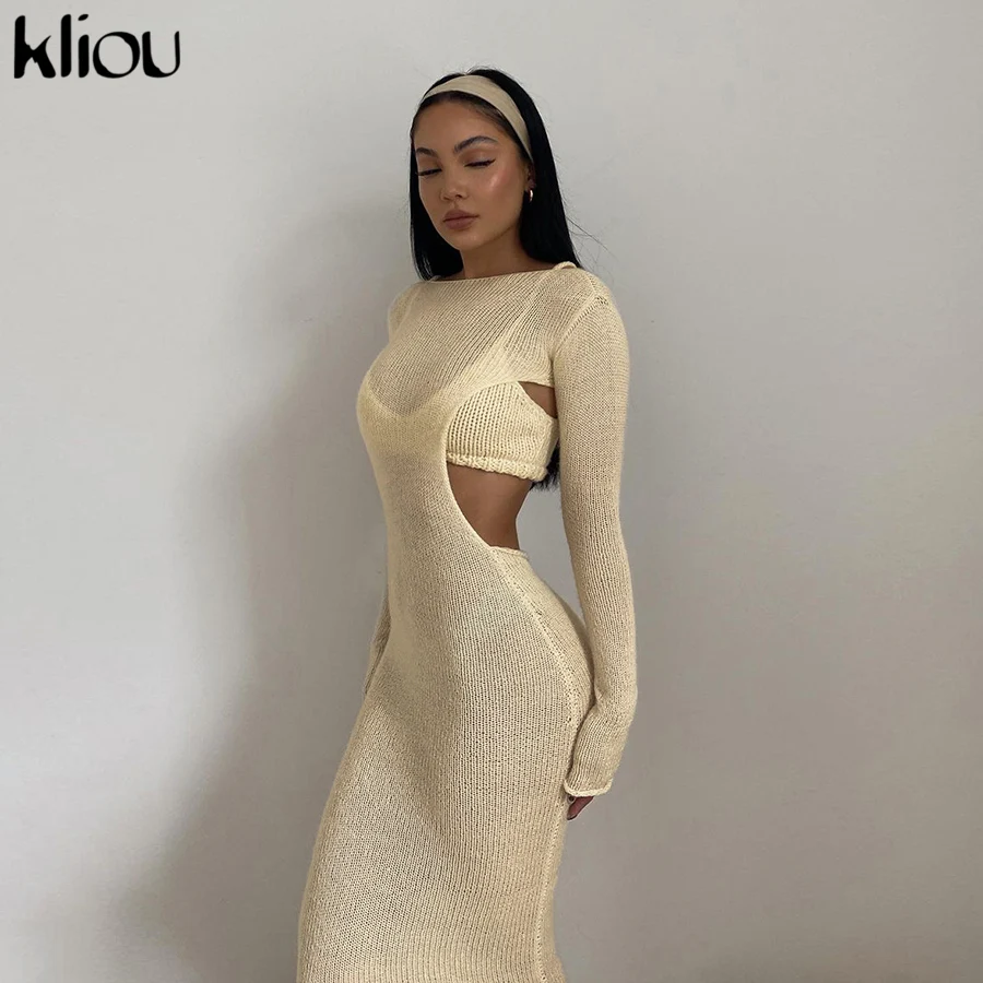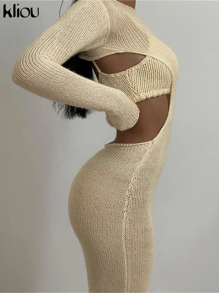 Женский трикотажный комплект из двух предметов Kliou, элегантный топ без рукавов с подкладкой + платье с длинным рукавом и открытой спиной
