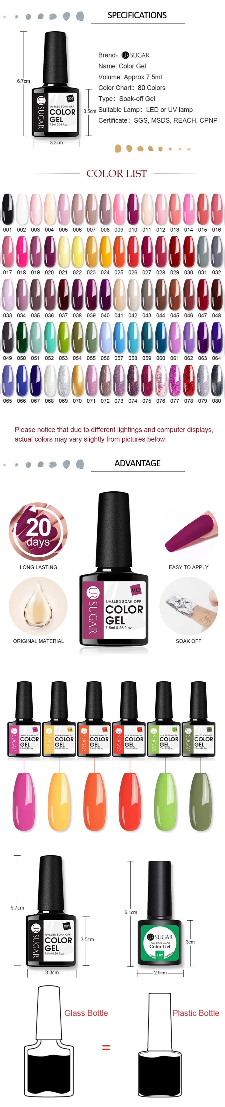 Спецификация:Бренд: UR SUGARТип: Гель-лакКоличество: 1 комплектОбъем Гель-лака: прибл. 7,5 млИнгредиент: смолаДлительный период: около 15 дней или болееИнструменты для отверждения: УФ-лампа или светодиодный светильникПосылка:1 комплект 7,5 мл UR SUGAR Цвет гель наборУникальное предложение:Он изготовлен из здоровых, экологически чистых, не ядовитых, резких химических материалов.Он быстро сохнет с любым УФ-светильник.Длительный срок службы не менее 2-3 недель, фантастические и супер яркие ногти для вас.Этот Гель-лак для ногтей легко наносится и впитывается.Позвольте вам профессиональный или домашний дизайн ногтей.Профессиональный подарок для ногтей для себя или вашей подруги.Профессиональное использование:Шаг 1. Очистите ногти, затем закрепите поверхность ногтей как обычный ноготь.Шаг 2. Полностью встряхните лак, он может сделать польский цвет сбалансированным. (ВАЖНО)Шаг 3. Сначала нанесите базовый гель, который может сделать лак длительным, вылечите УФ-гелевой лампой или светодиодный светильник для ногтей. (Необходимо)Шаг 4. Нанесите первый слой цветного УФ-геля непосредственно, закрепите УФ-лампой в течение 2 минут или вылечите светодиодный светильник в течение 60 секунд.Шаг 5. Нанесите второй слой цветного геля, а затем немедленно закрепите УФ-лампой в течение 2 минут или вылечите светодиодный светильник в течение 60 секунд.Шаг 6. Покрытие без протирания, излечивается УФ-лампой или светодиодный лампой.Удалите наш УФ-гель для ногтей шаг:• Замочите ногти в миске, заполненной небольшим количеством ацетона, или оберните каждый ноготь в ватную подкладку, смоченную ацетоном, примерно на 5-10 минут.• Продукт начнет становиться мягким, и вы можете аккуратно отпилить его или сдвинуть с помощью небольшой деревянной палочки.Теплое напоминание:1. Избегайте контакта с кожей. Если возникают покраснения или другие признаки нежелательной реакции, немедленно прекратите использование.2. Плотно закрываются. Держите подальше от солнечного света. Хранить в недоступном для детей месте.Примечание:Пожалуйста, избегайте контакта с кожей. В чехол несчастных случаев или в том случае, если вы чувствуете себя плохо, немедленно обратитесь к врачу (показать на этикетке в тех случаях, когда это возможно)