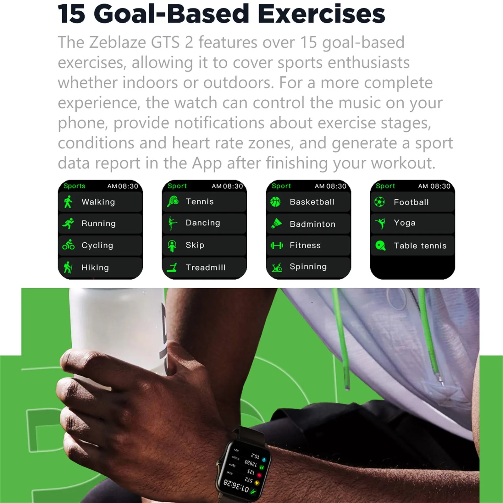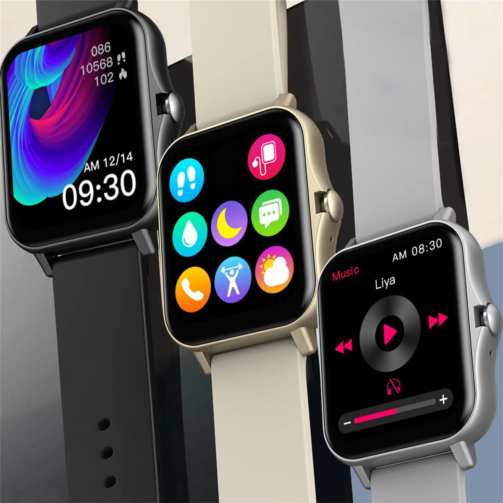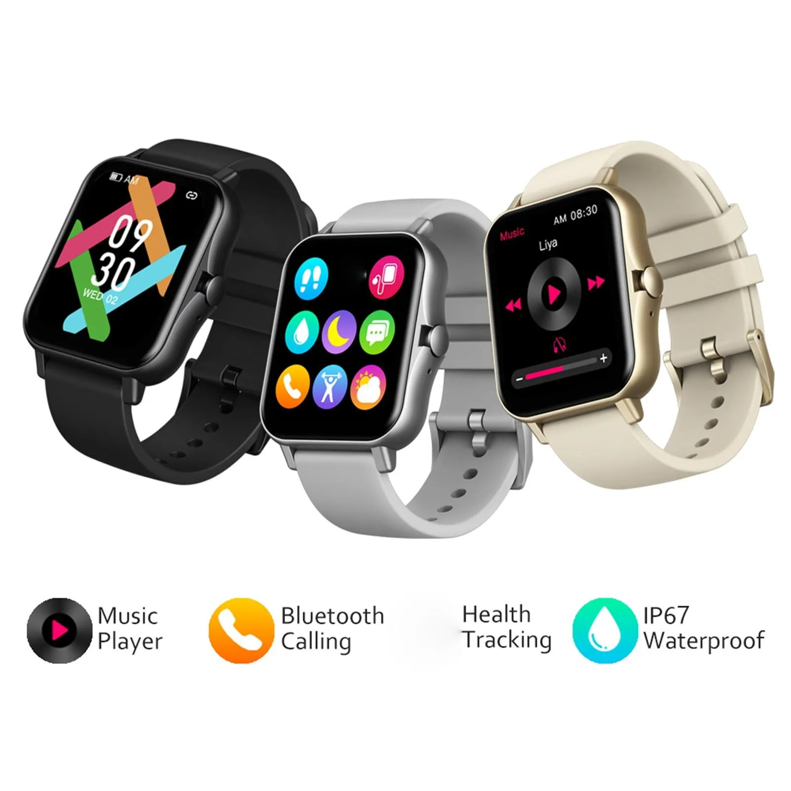 Независимый музыкальный плеер, bluetooth-вызов (ответ/Звонки) 15 упражнений на основе цели, мониторинг качества сна, пошаговое отслеживание, отслеживание потребления калорий, ежедневный шаг, темп и расстояние в реальном времени, празднование цели, напоминание о действии, уведомления о смартфоне, прогноз погоды, секундомер, будильник, поиск звонков, Поверните запястье для обнаружения и управления музыкой.