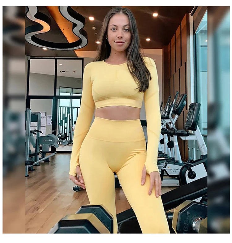 Женский бесшовный комплект для йоги из 2 предметов, одежда для спортзала, леггинсы для фитнеса + укороченные рубашки, спортивный костюм, женский спортивный костюм с длинным рукавом, одежда для активного отдыха