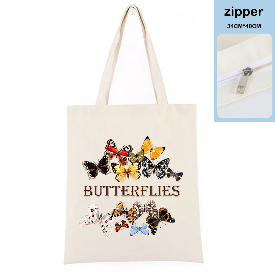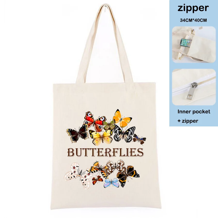 Модная милая розовая сумка для покупок, хлопковая брендовая Холщовая Сумка для покупок с аниме бабочками, на молнии, цвета хаки, черная сумка через плечо, женская сумка-тоут