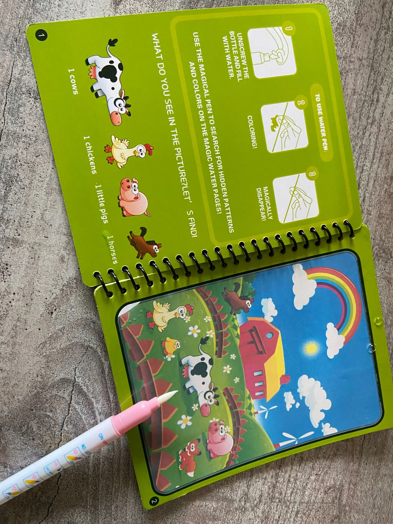 Не однозначное впечатление от заказа. Все, как на фото продавца. Картонная книжка-раскраска на спирали. В комплекте водный карандаш. В подарок наклейки и ещё картинка-игрушка. Мне не понятно- зачем наносить на картон эти, проявляющие водой, картинки? Картон от воды разбух. В целом понравилось. Картинки яркие и рисунки на разворотах. Продавец молодец. Спасибо.