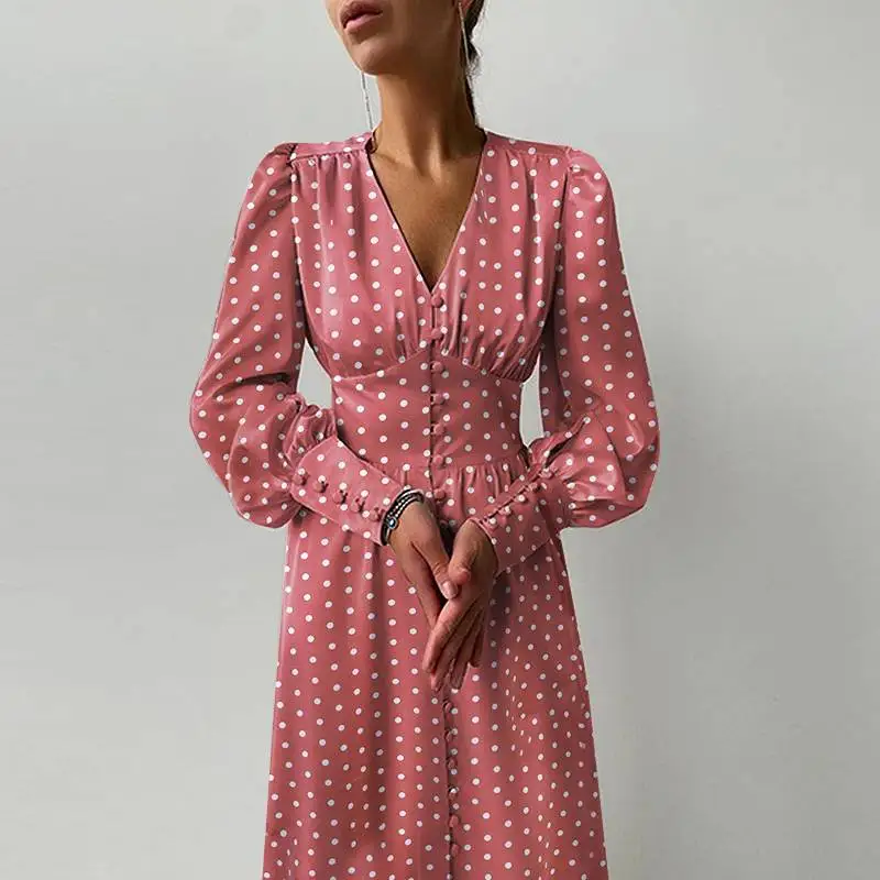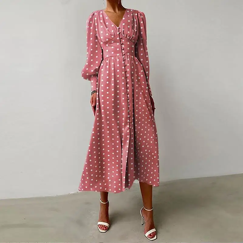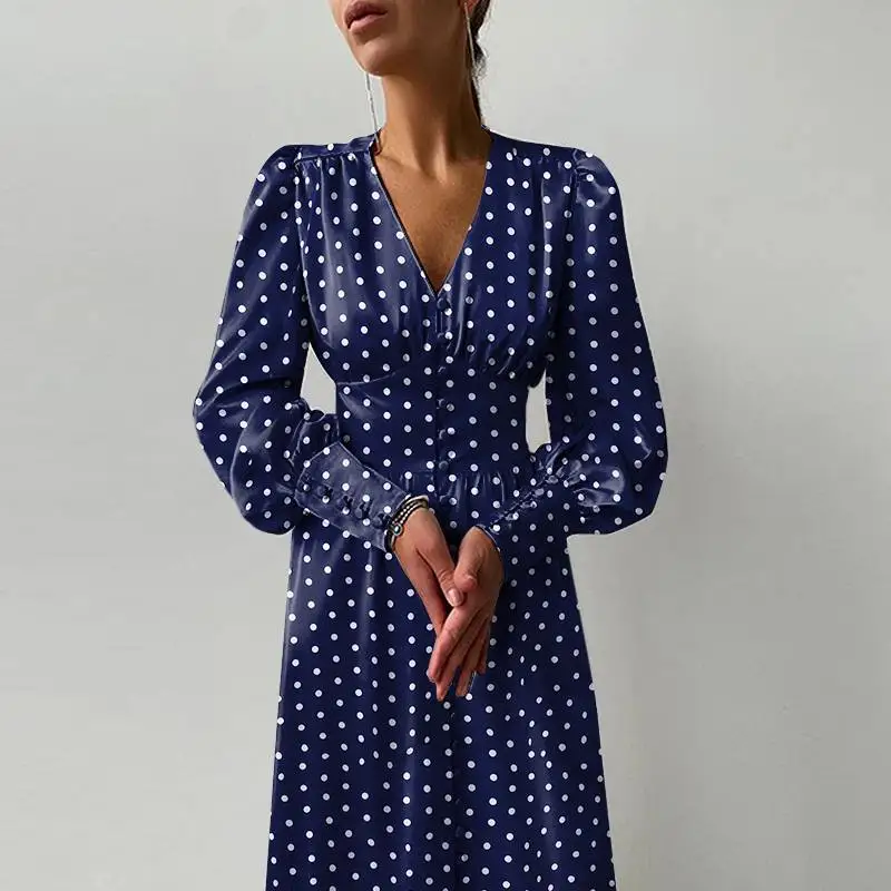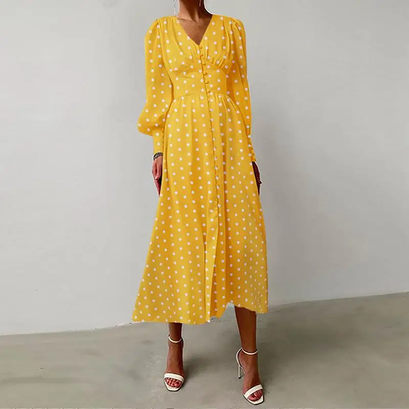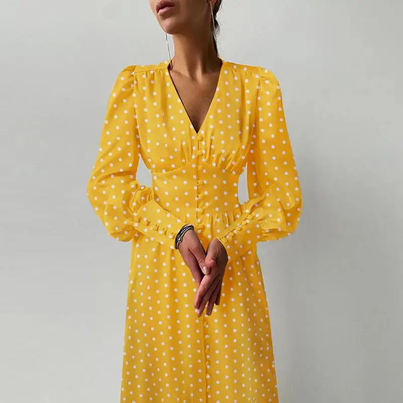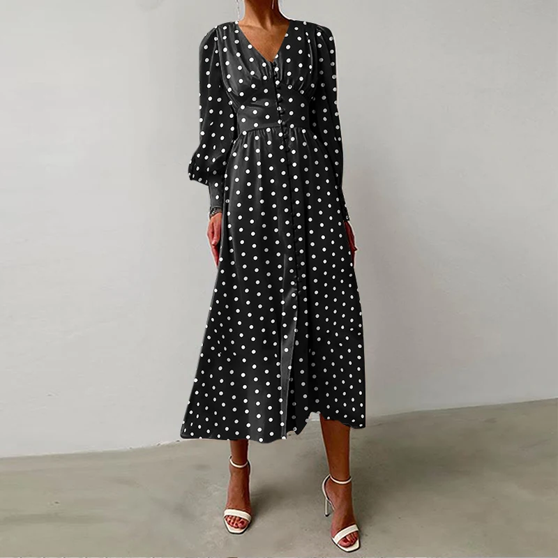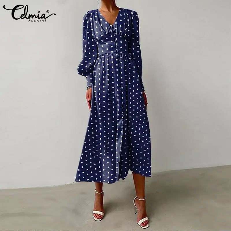 Модное платье-миди Celmia с пышными рукавами, повседневное женское праздничное платье в горошек с V-образным вырезом, романтичные женские элегантные однобортные халаты