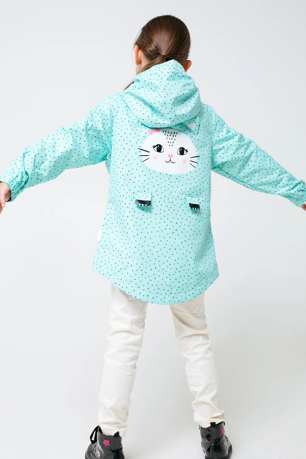 Описание: Куртка для девочки без утеплителя. Рекомендованный температурный режим: от +15 и выше без поддевы и от +8 и выше с поддевой. Мембрана 1000/1000. Верхняя ткань покрыта тефлоновой пропиткой, которая помогает отталкивать воду и грязь. Подклад комбинированный: 35% хлопок, 65% полиэстер. Подклад в размере 80-86 - 100% хлопок. Застёгивается на нейлоновую молнию. Предусмотрена защита подбородка. Внутри - дополнительная ветрозащитная планка. Спинка удлинена и закруглена. Вшитый капюшон утягивается с помощью шнурка со стопперами. Рукава с эластичными манжетами фиксируются на запястьях с помощью липучек. На спинке - крупный принт с аппликацией. Впереди удобные карманы без застёжек.