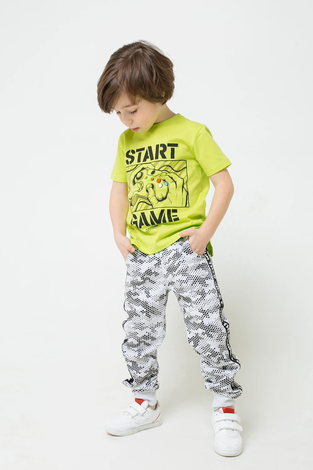 Описание: Футболка для мальчика с короткими втачными рукавами. Сшита из лёгкого трикотажа супрем цвета "лайм". Украшена крупным принтом на полочке и полоской с надписью на рукаве. Спинка удлинена. По бокам разрезы.