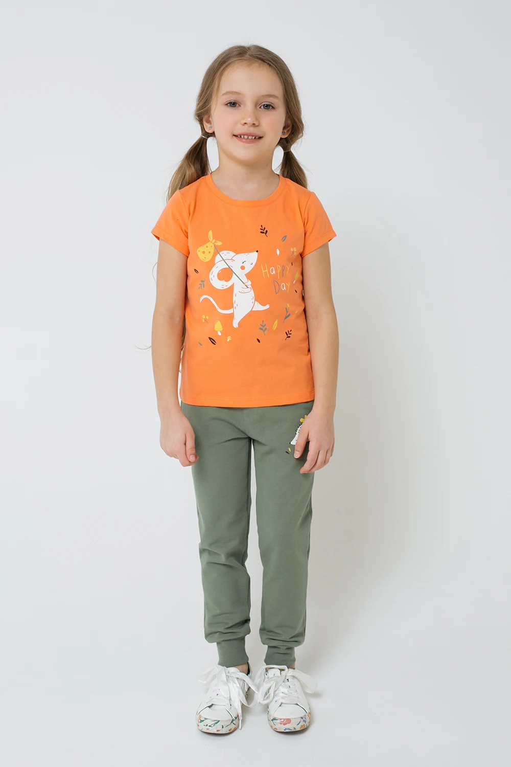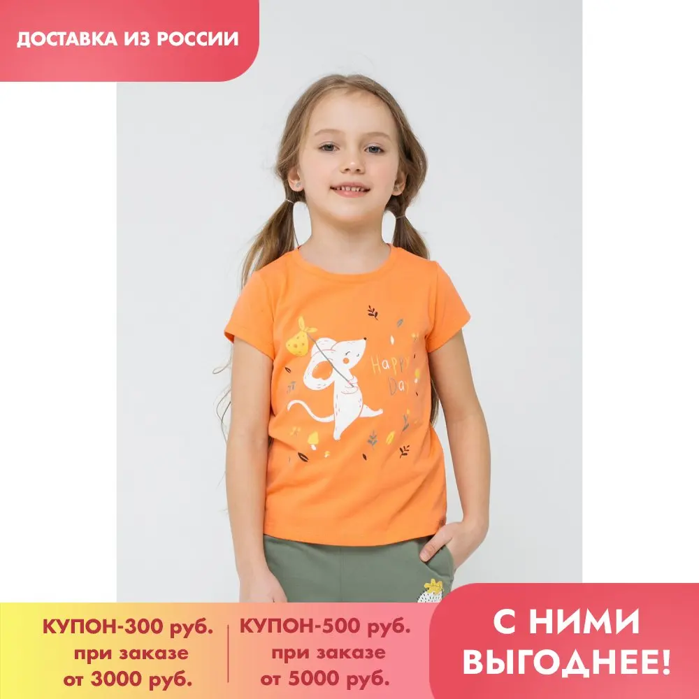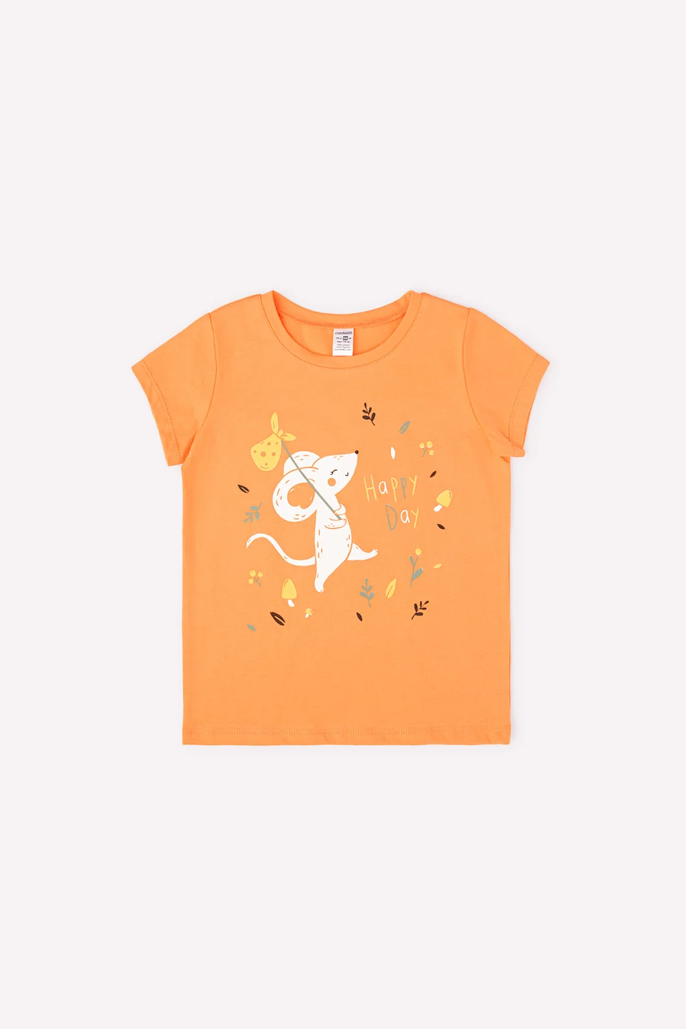 Описание: Футболка для девочки с короткими рукавами. Выполнена из лёгкого трикотажа супрем в оттенке "грейпфрут". Украшена принтом с изображением мышки.