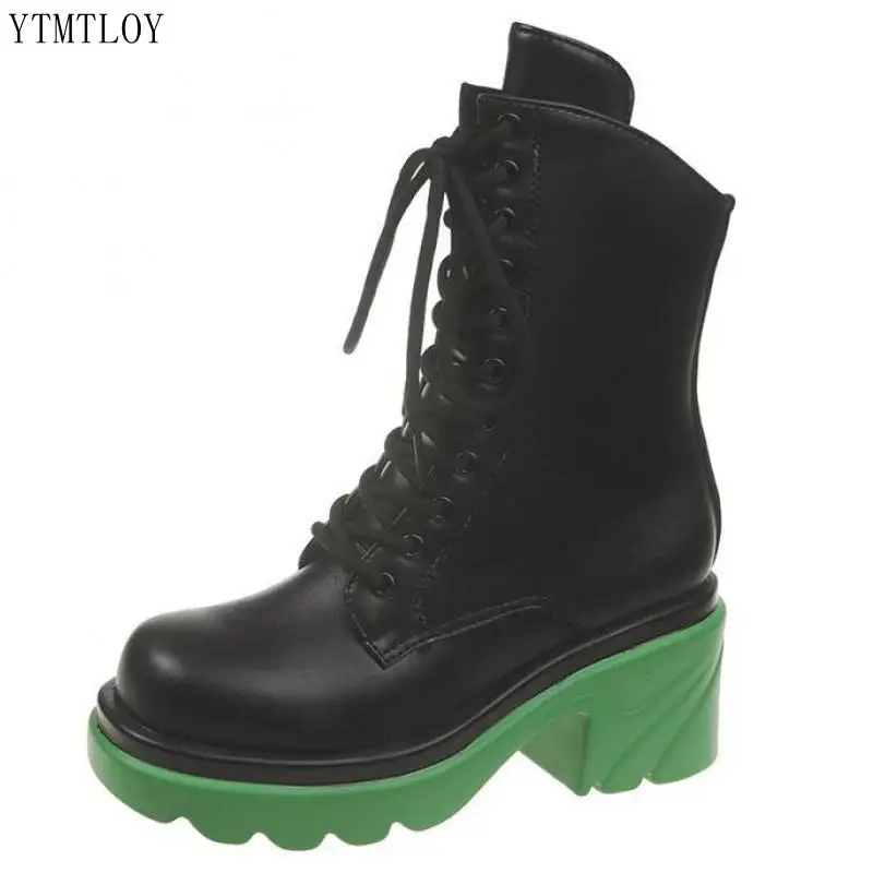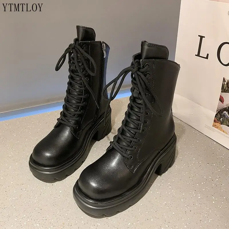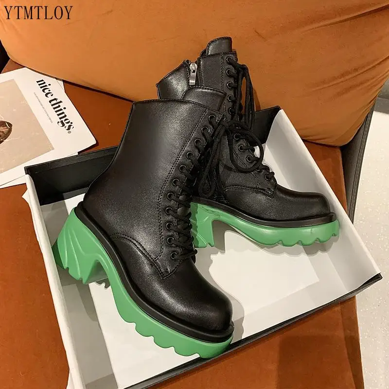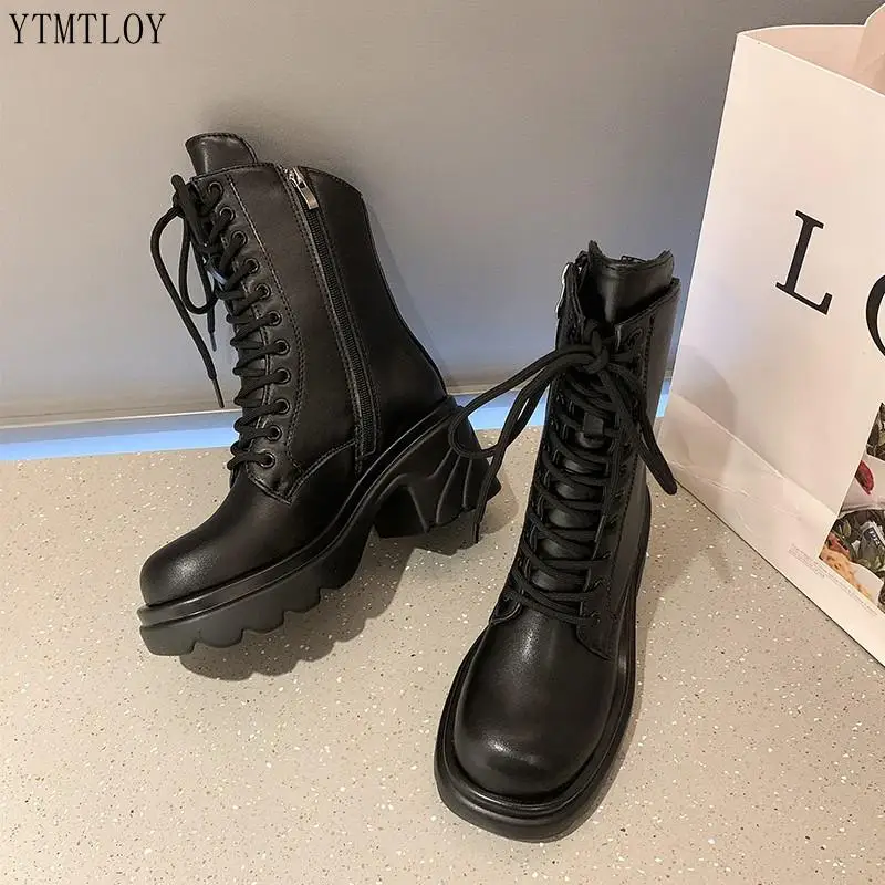 Женские кожаные ботильоны на массивном каблуке, короткие ботинки на платформе, на шнуровке, на молнии, в стиле ретро, с круглым носком и перекрестной шнуровкой, 2022