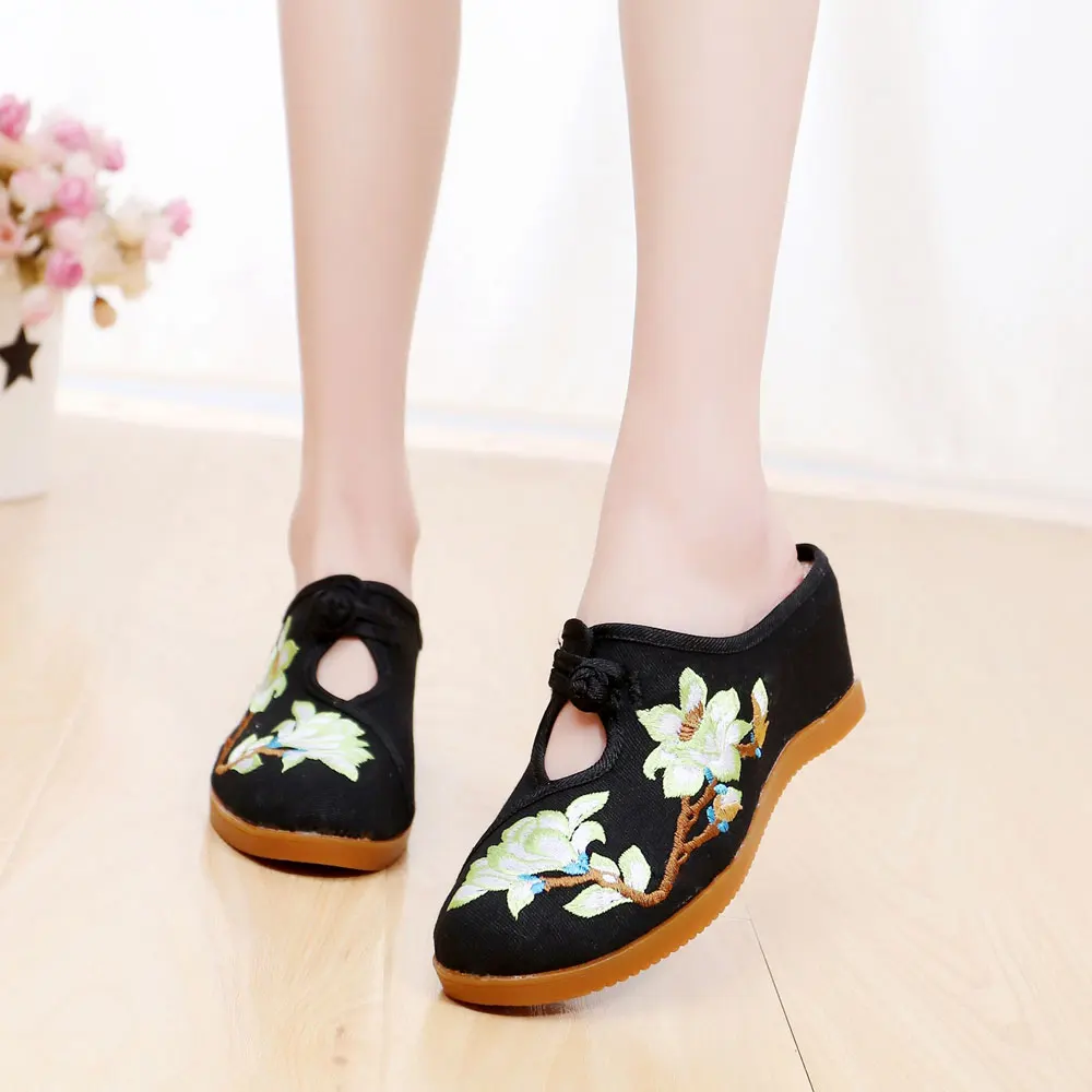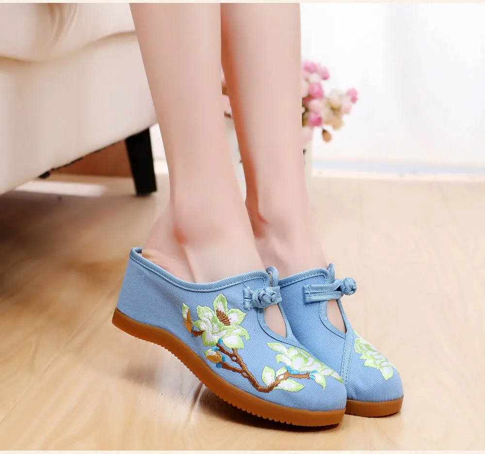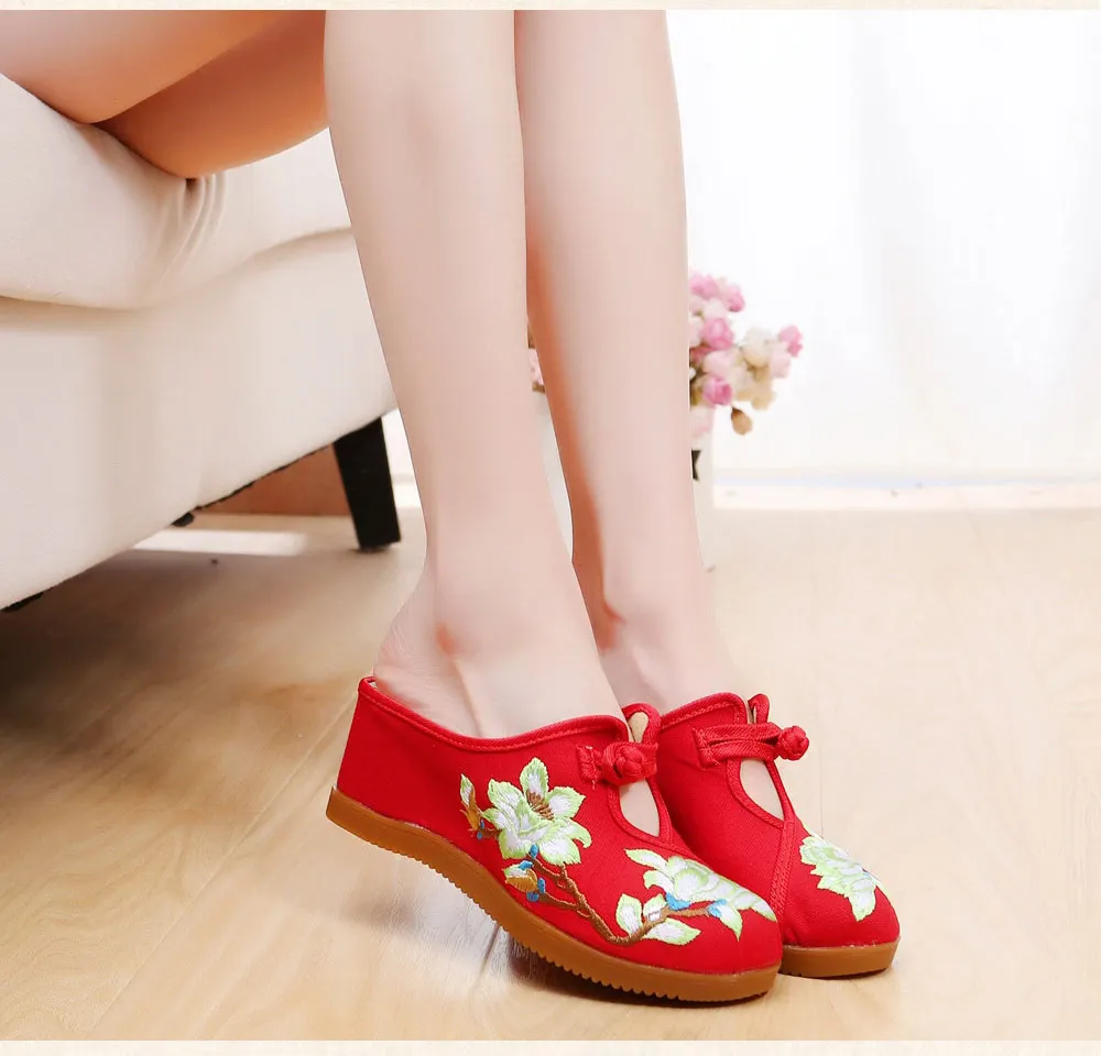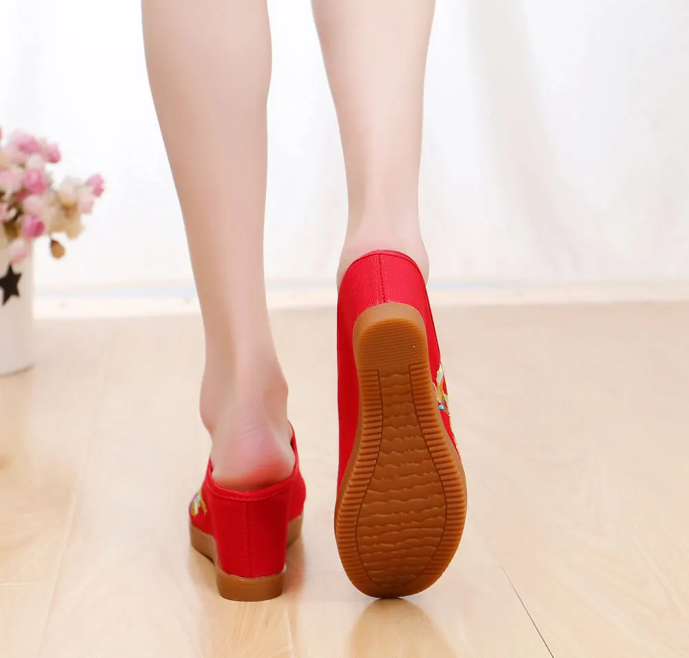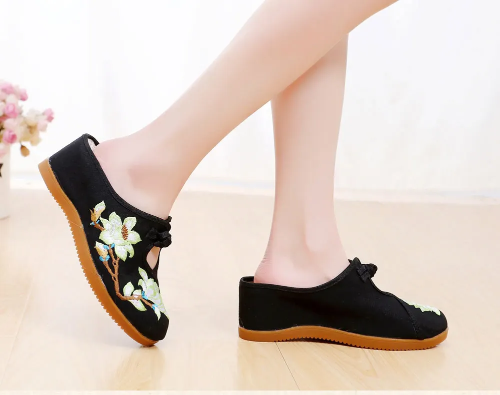 Сабо женские тканевые с цветочной вышивкой, 7 см, на танкетке