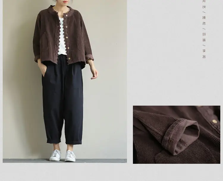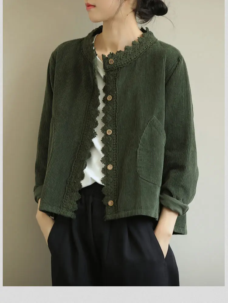 Винтажная одежда, Вельветовая рубашка, куртка для женщин, кружевная строчка, свободное осеннее Женское пальто с круглым вырезом, повседневная короткая куртка, новинка 2021