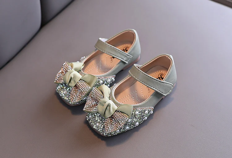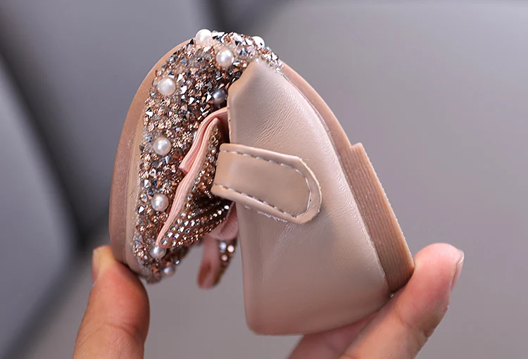 Туфли детские кожаные блестящие вечерние стразами и бантом, на плоской подошве