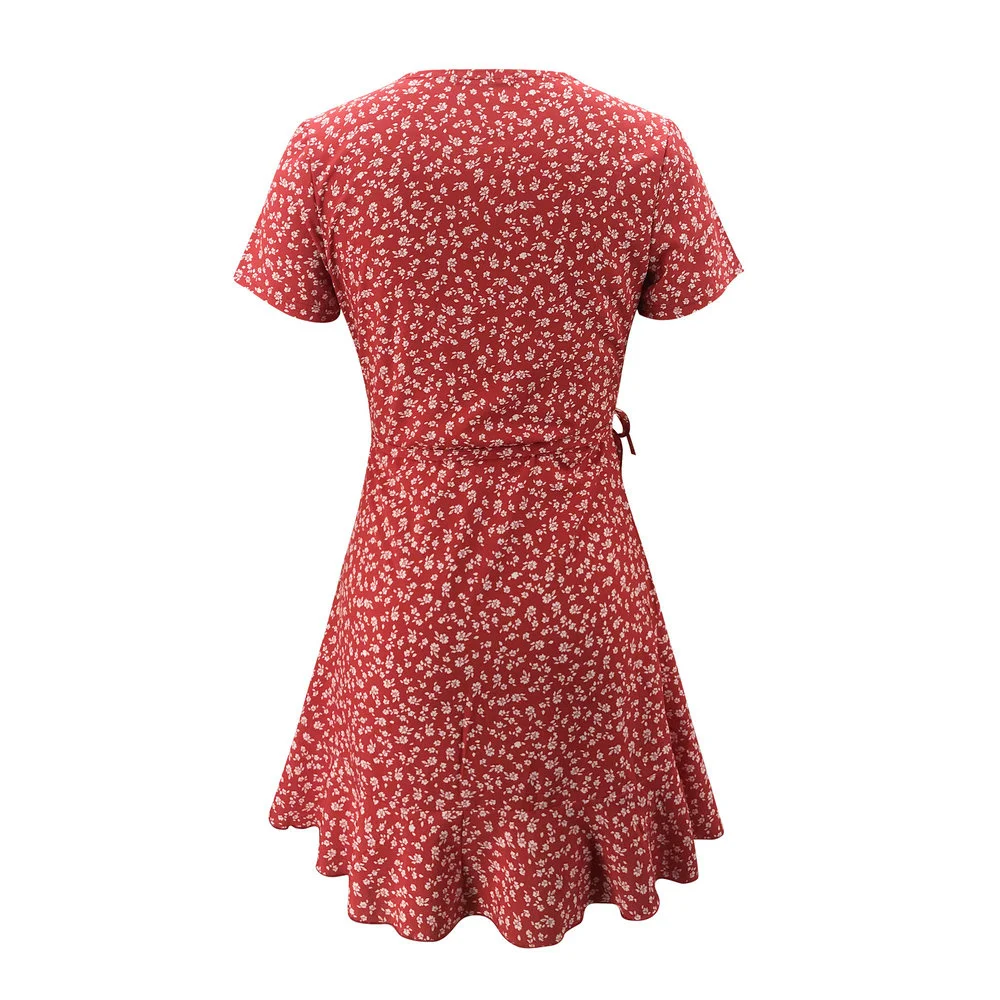 Летнее женское Короткое платье-трапеция, с цветочными оборками и V-...
