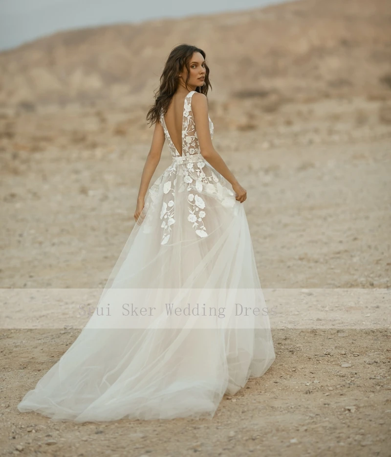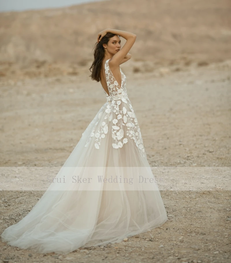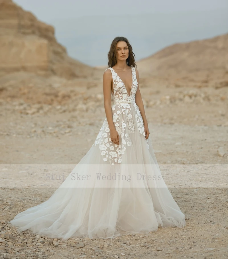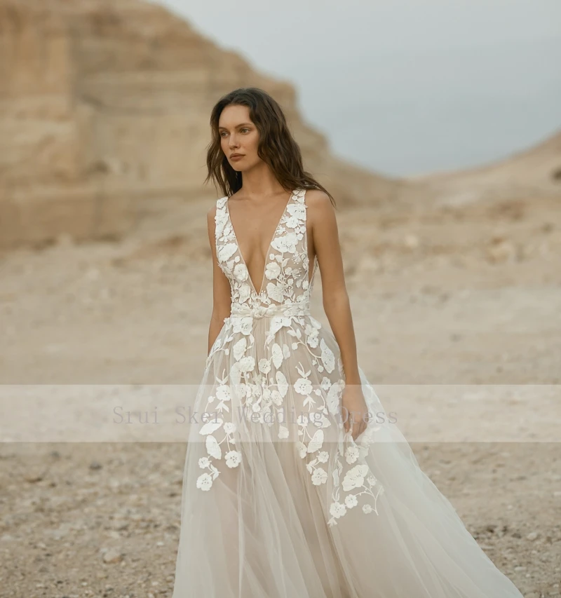 Винтажные пикантные свадебные платья в стиле бохо с V-образным вырезом и 3D аппликацией, пляжные богемные свадебные платья, трапециевидный халат для невесты с открытой спиной