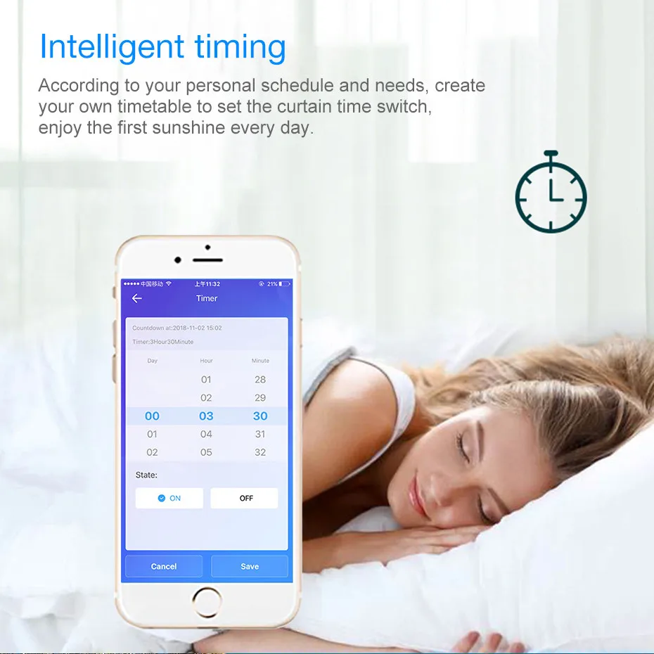 Сенсорное управление: пауза/открытие/закрытиеУправление приложением: пауза/открытие/закрытиеПроцент открытый/закрытый занавесРасписание/таймер/акцииРаботает с Amazon AlexaРаботает с Google HomeРаботает с IFTTTПульт дистанционного управления: используйте r можно использовать смартфон для удаленного управления открыванием/закрытием/Pa Используйте домашние шторы в любое время и в любом месте с помощью приложения до тех пор, пока телефон имеет 2G/3G/4G/WIFI сеть. Это делает вашу бытовую технику умной в течение 1 секунды. Совместимость с iOS и Android OS.Загрузка приложения: eWeLink.
