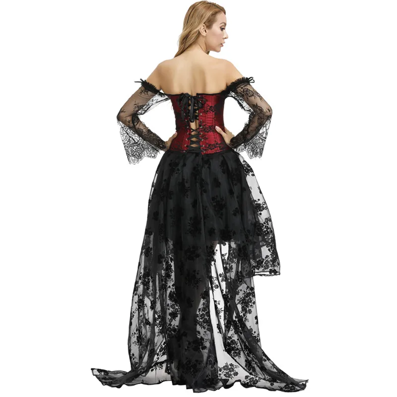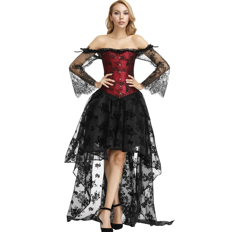 1 * женский красный корсет с кружевными рукавами 1 * юбка в стиле стимпанк