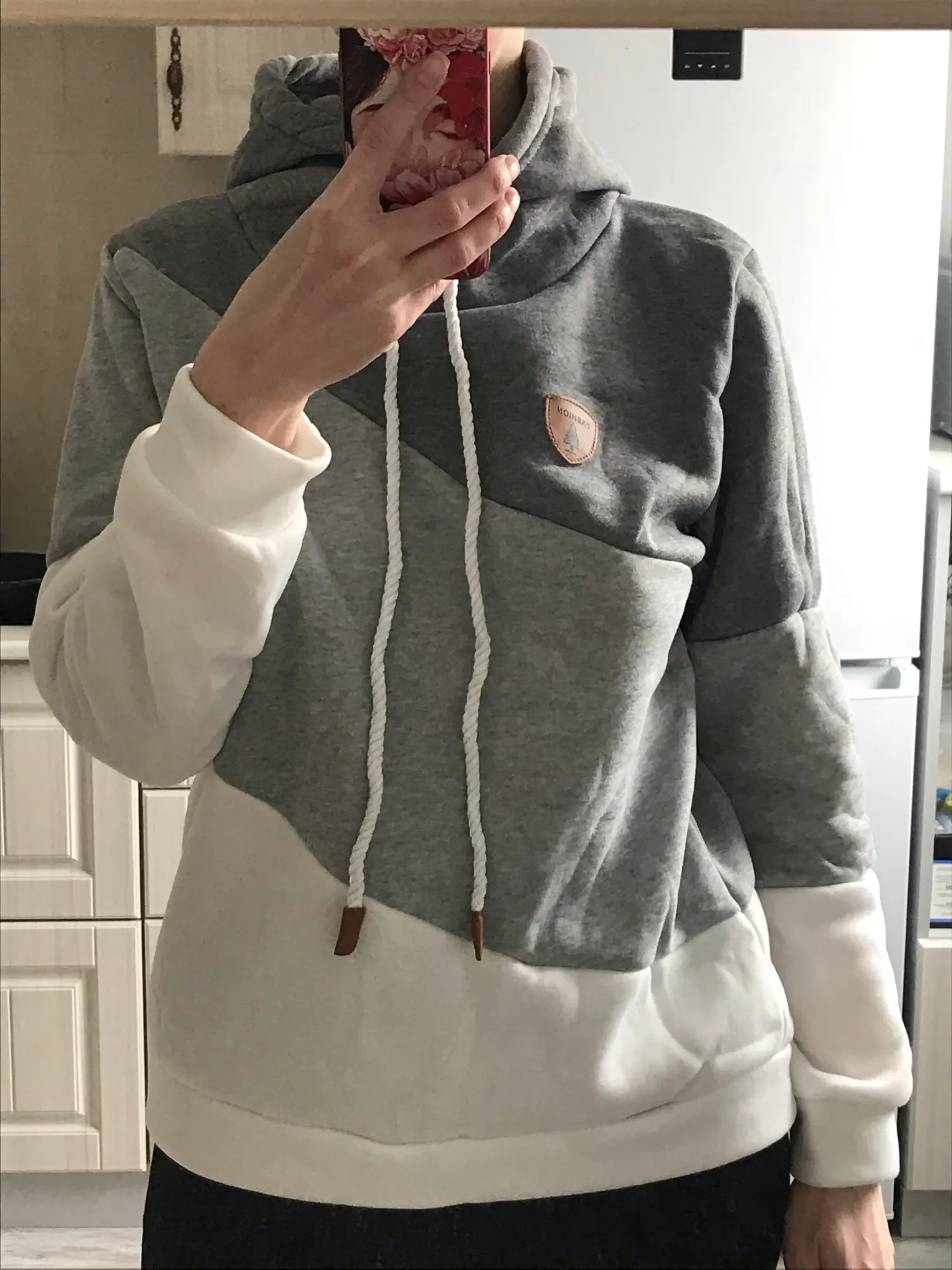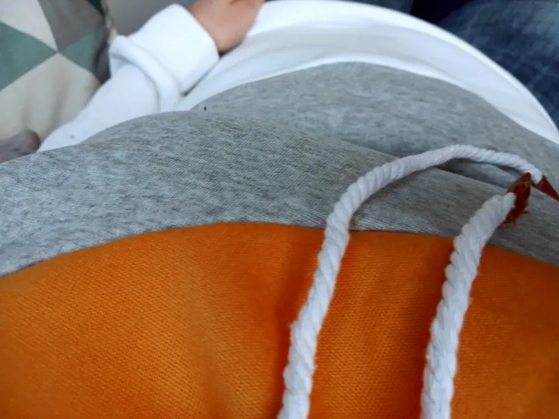 Внизу толстовки цвет не серовато-белый, как на фото, а белый-пребелый. На рост 179 и вес 65 взяла размер XL, сидит очень свободно, рукава даже длинноваты.