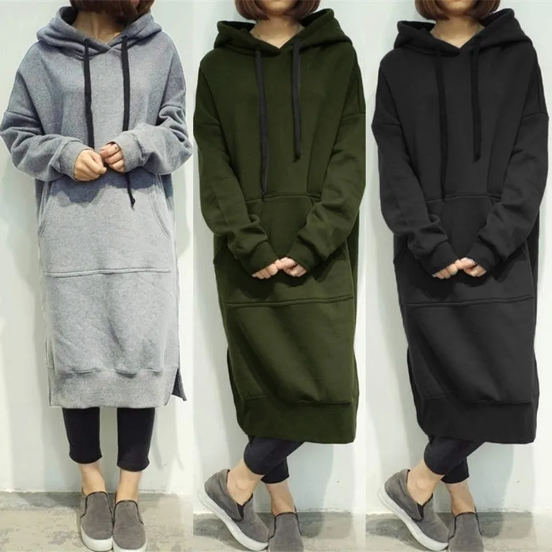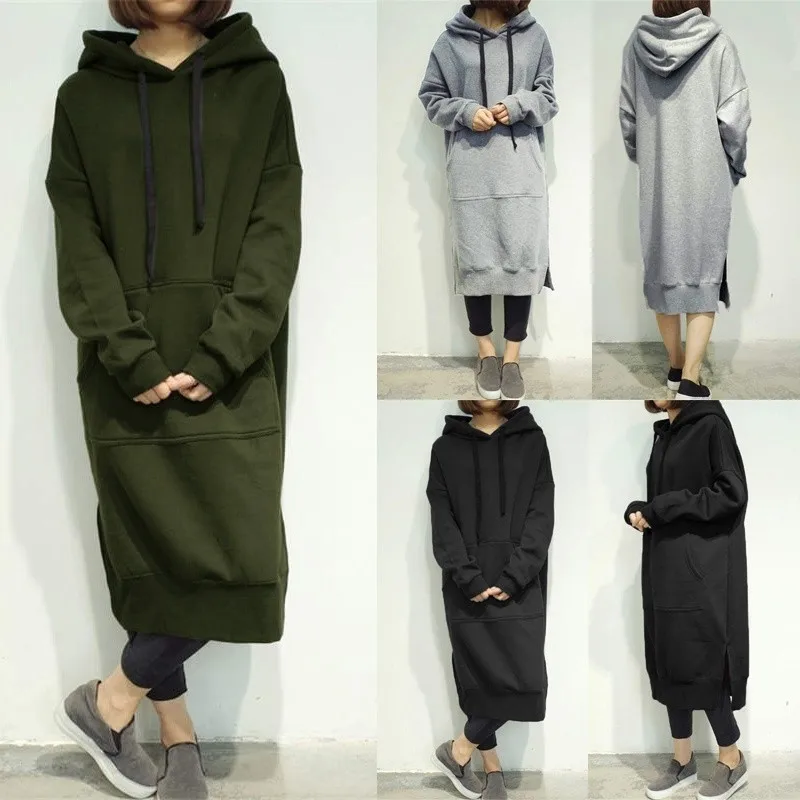 Женские длинные толстовки на осень и зиму, однотонные повседневные свободные толстовки с капюшоном, мешковатый пуловер, Свитшот оверсайз, платье с капюшоном