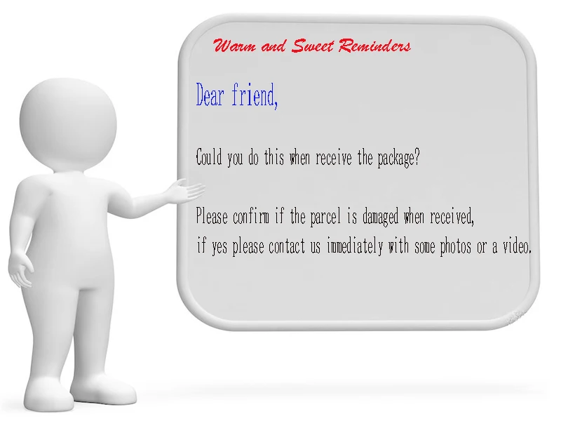 Дорогой друг,Можете ли вы сделать это, когда получите посылка?1. Пожалуйста, подтвердите, если посылка повреждена при получении, если да, пожалуйста, немедленно свяжитесь с нами с некоторыми фотографиями или видео.2. Все товары тщательно проверяются и упаковываются перед отправкой.Пожалуйста, не устанавливайте перед тестированием. Если вы остались довольны продуктами после тестирования. Затем вы можете установить на свой телефон. Это непростая работа, мы настоятельно рекомендуем вам заставить профессионального специалиста сделать это для вас.Пожалуйста, будьте осторожны с гибким кабелем и установите под выключенным состоянием питания, если сделай сам,Обратите внимание, что если вы обнаружили проблемы после установки, товар больше не может быть возвращен обратно, потому что это бесполезно для нас.Если вы не удовлетворены, пожалуйста, свяжитесь с нами вовремя, мы несем ответственность. Если вы заинтересованы в нашей продукции, пожалуйста, свяжитесь с нами. Наша команда продаж может предоставить информацию, которую вы хотите узнать.Если мы не на связи, пожалуйста, укажите ваше имя и контактные данные. Мы свяжемся с вами.