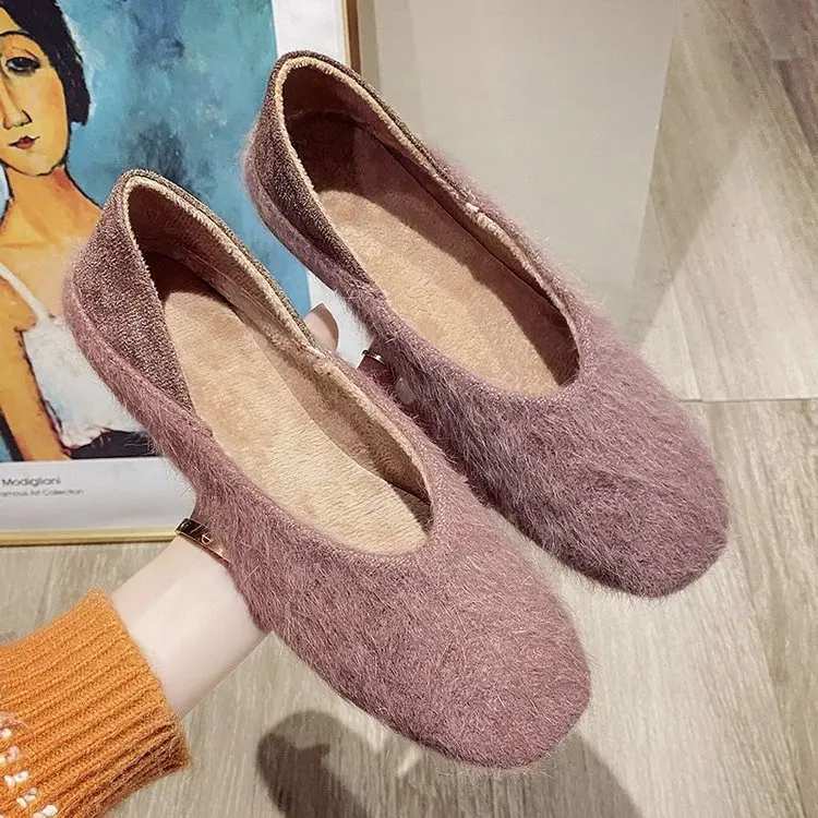 Женские туфли ручной работы, плюшевые меховые лоферы, плоская подошва, круглый носок, украшение с перьями, теплые, Осень-зима