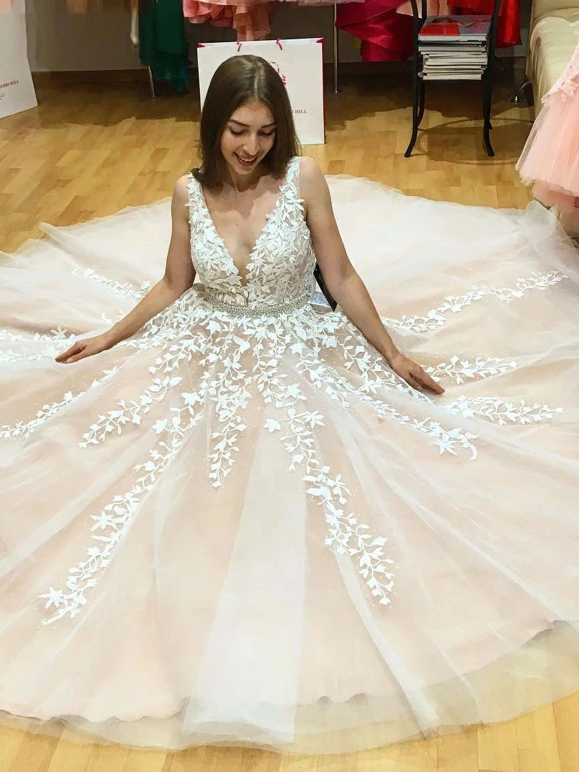 Недорогие кружевные свадебные платья 2021 с V-образным вырезом, светлый цвет шампанского, длина в пол, аппликация, открытая спина, строчка искусственной кожи