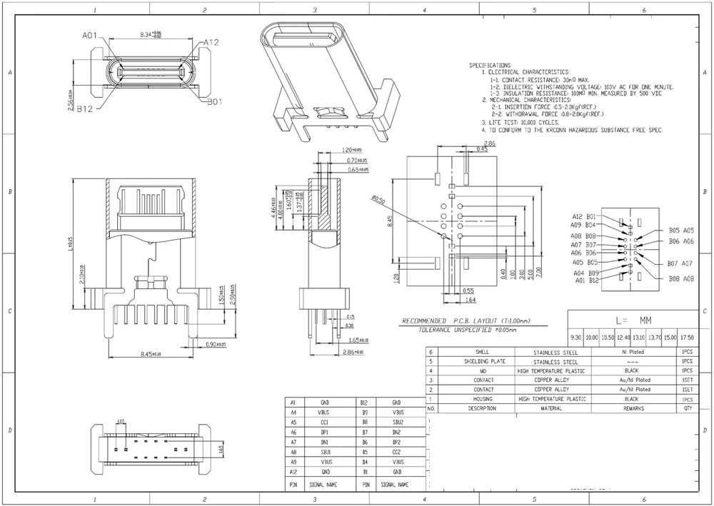 Универсальный 24-контактный разъем Micro USB 3,1, длина 0,8, 9,3 по...