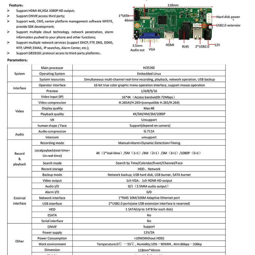 Специфика доски (10ch):Основной процессор: Hi3536EОперационная система: Встроенные системные ресурсы Linux одновременная Многоканальная Запись в реальном времени, воспроизведение, управление сетью, резервное копирование через USBИнтерфейс оператора: 16-битное полноцветное меню, Поддержка мышиПредварительный просмотр: 1/4/8/9/10Видео видео вход: (IP) 10*4K (пропускная способность доступа 72 Мбит/с)Сжатие видео: H.265AI/H.265 + (совместимый H.265/H.264)Качество дисплея: макс.: 4KКачество воспроизведения: 4K/5M/4M/3M/1080PПоддержка формы человека/лица (зависит от камеры)Сжатие аудио G.711AРежим записи: Руководство> Будильник> Динамическое Обнаружение> ВремяLocalpayback (в режиме реального времени + в режиме реального времени):4K(1 * В режиме реального времени)/5M(1 + 1)/4M(2 + 1)/3M(3 + 1)/1080P(5 + 1)Режим поиска: Поиск по времени/календарю/событию/каналу/записи лица HDD, сетиРежим резервного копирования: сетевое резервное копирование, USB жесткий диск, USB горелкаВидеовыход: 1ch VGA,1ch HDMI HD выходАудио :( 3,5 мм аудио выход)Сетевой интерфейс: 1 * RJ45 10 м/100 м адаптивный порт EthernetИнтерфейс USB: 2 порта USB2.0 (один интерфейс расширения USB забронирован)HDD: 1 SATA (до 14 ТБ для каждого диска)ONVIF: ПоддержкаИсточник питания: 12 В/2 АПотребляемая мощность: <10 Вт (без жесткого диска)Рабочая температура окружающей среды: 0 ℃ -55 ℃, влажность: 10%-90% RH , Atm:86kpa-106kpРазмер 118 мм * 46 мм вес в общей сложности около 44 гСпецифика доски (16ch):Основной процессор: Hi3536EОперационная система: Встроенные системные ресурсы Linux одновременная Многоканальная Запись в реальном времени, воспроизведение, управление сетью, резервное копирование через USBИнтерфейс оператора: 16-битное полноцветное меню, Поддержка мышиПредварительный просмотр: 1/4/8/9/16Видео видео вход: (IP) 16*4K (пропускная способность доступа 72 Мбит/с)Сжатие видео: H.265AI/H.265 + (совместимый H.265/H.264)Качество дисплея: макс.: 4KКачество воспроизведения: 4K/5M/4M/3M/1080PПоддержка формы человека/лица (зависит от камеры)Сжатие аудио G.711AРежим записи: Руководство> Будильник> Динамическое Обнаружение> ВремяLocalpayback (в режиме реального времени + в режиме реального времени):4K(1 * В режиме реального времени)/5M(1 + 1)/4M(2 + 1)/3M(3 + 1)/1080P(5 + 1)Режим поиска: Поиск по времени/календарю/событию/каналу/записи лица HDD 、 сетьРежим резервного копирования: сетевое резервное копирование, USB жесткий диск, USB горелкаВидеовыход: 1ch VGA,1ch HDMI HD выходАудио :( 3,5 мм аудио выход)Сетевой интерфейс: 1 * RJ45 10 м/100 м адаптивный порт EthernetИнтерфейс USB: 2 порта USB2.0 (один интерфейс расширения USB забронирован)HDD: 1 SATA (до 14 ТБ для каждого диска)ONVIF: ПоддержкаМощность питания: 12 В/5AПотребляемая мощность: <10 Вт (без жесткого диска)Рабочая температура окружающей среды: 0 ℃ -55 ℃, влажность: 10%-90% RH , Atm:86kpa-106kpРазмер 118 мм * 46 мм вес в общей сложности около 44 г