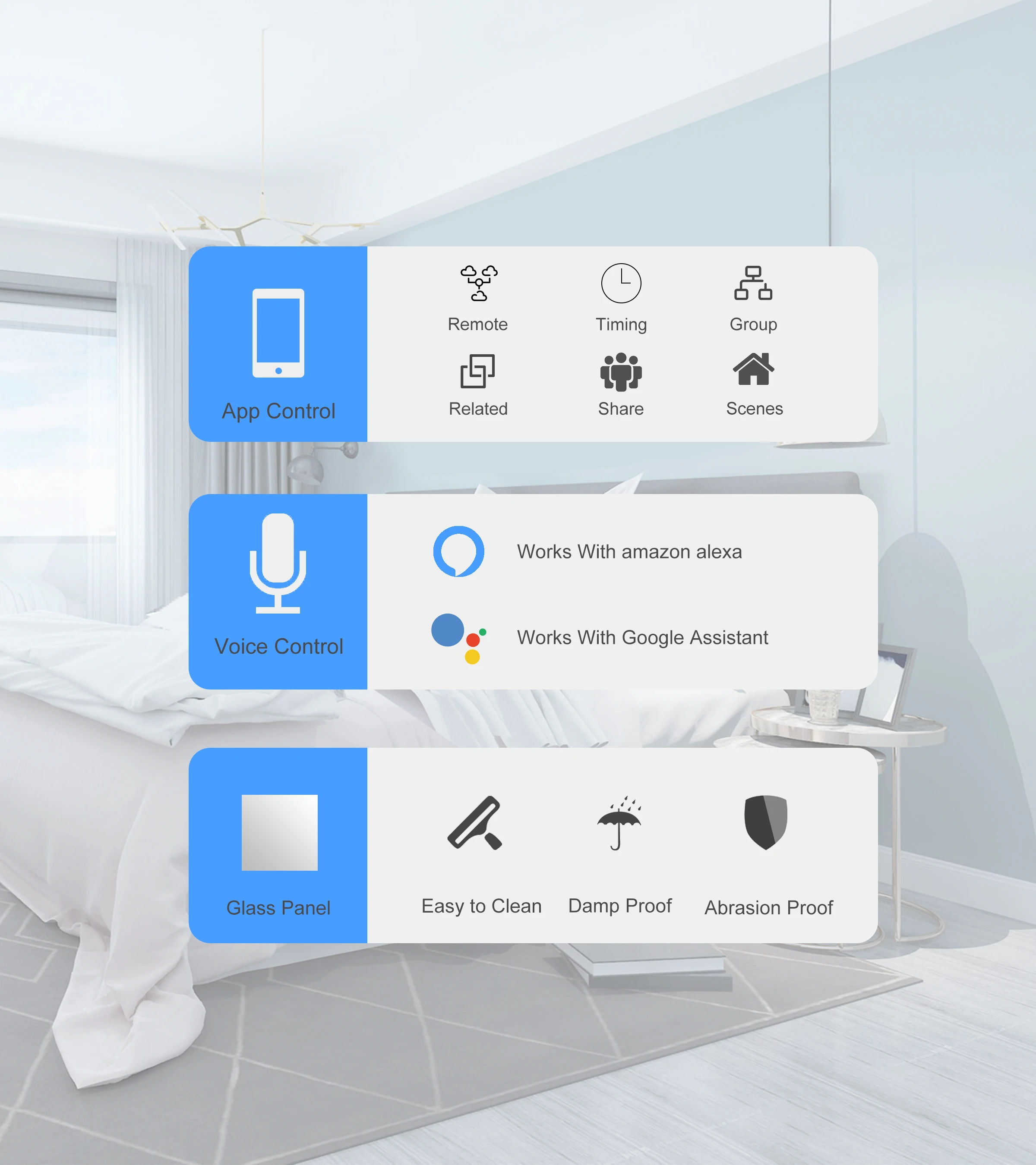 А. Приложение Smart Remote Control: удобно управлять рассветом и индикатор подсветки с помощью приложения Tuya независимо от того, где вы находитесь. (Совместимость с Android и iOS.) Кроме того, вы можете легко поделиться им со своей семьей, чтобы связаться с миром с приложением Tuya.