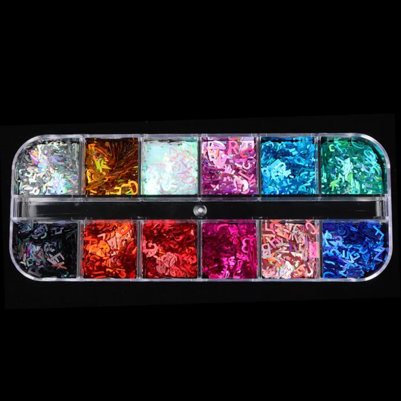 12 сетчатых упакованных в коробку лазерных английских букв и блесток для ногтей