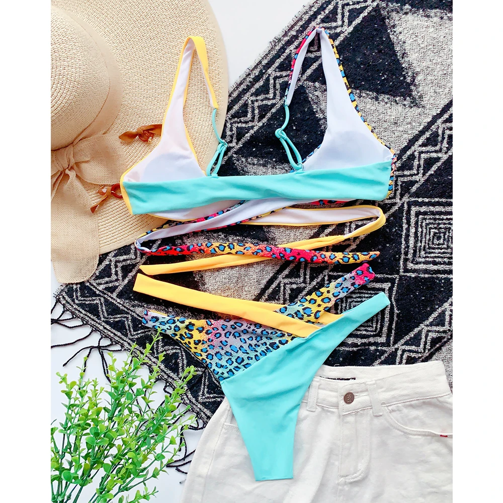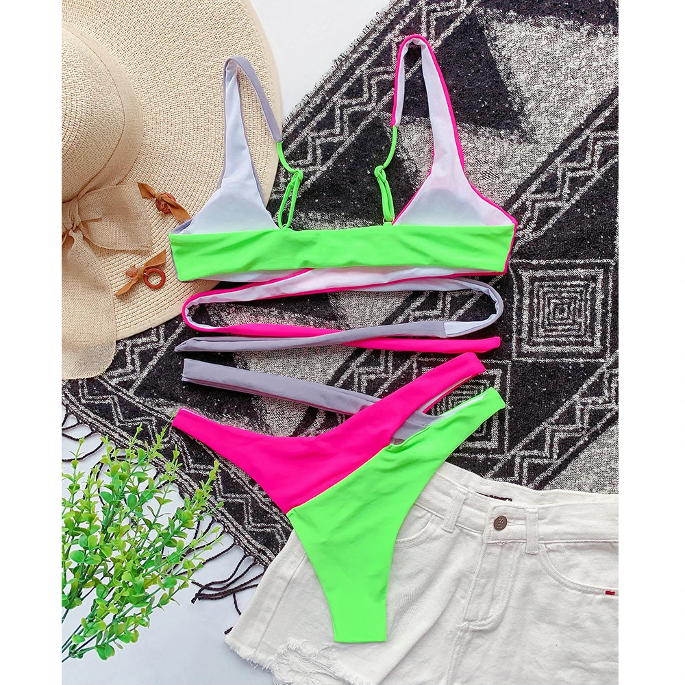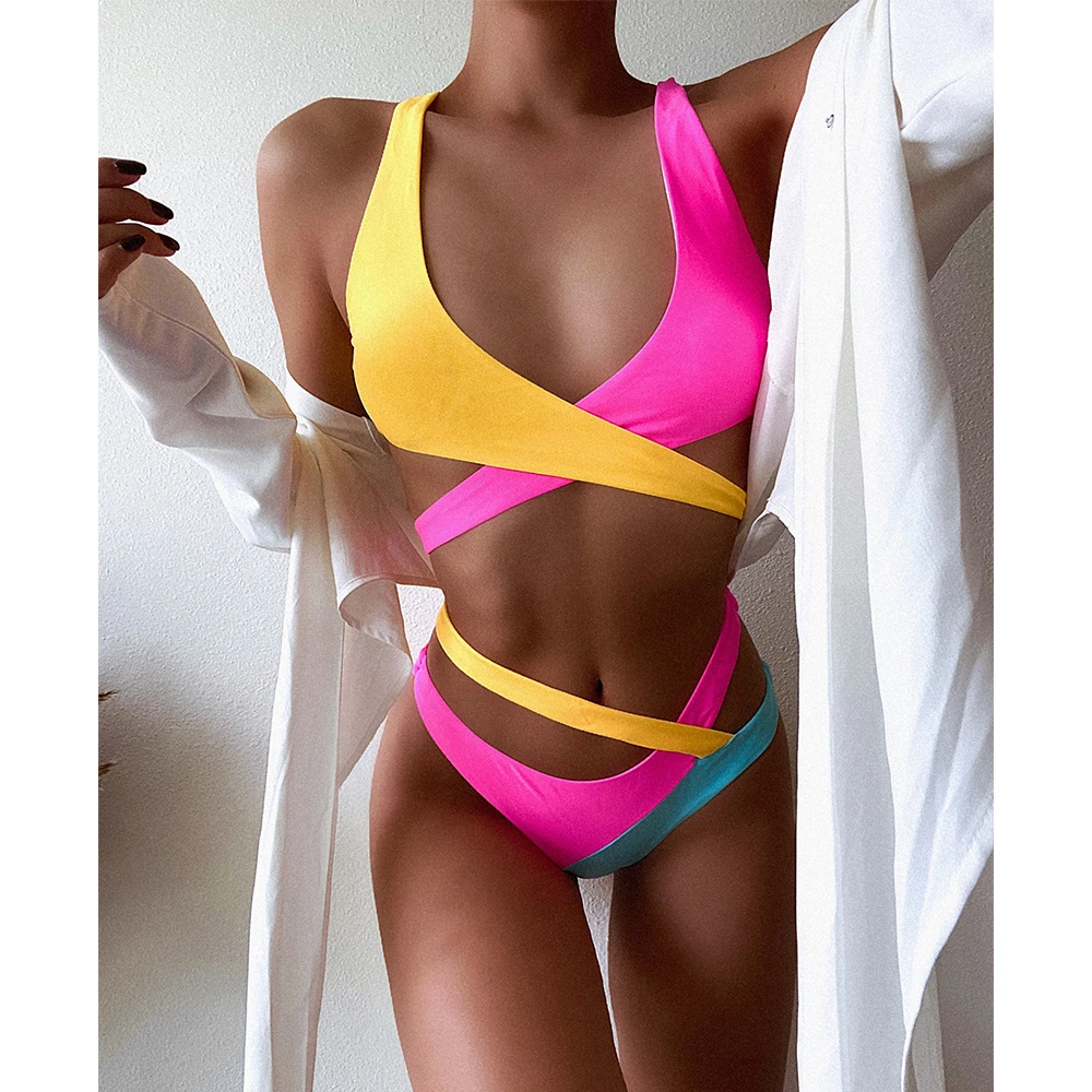Новинка 2021, пикантный комплект бикини с низкой талией, бандажный купальник, Женский однотонный купальник в стиле пэчворк на бретельках, пляжная одежда, купальный костюм, бикини