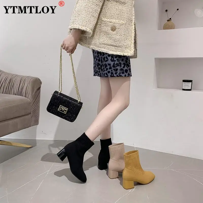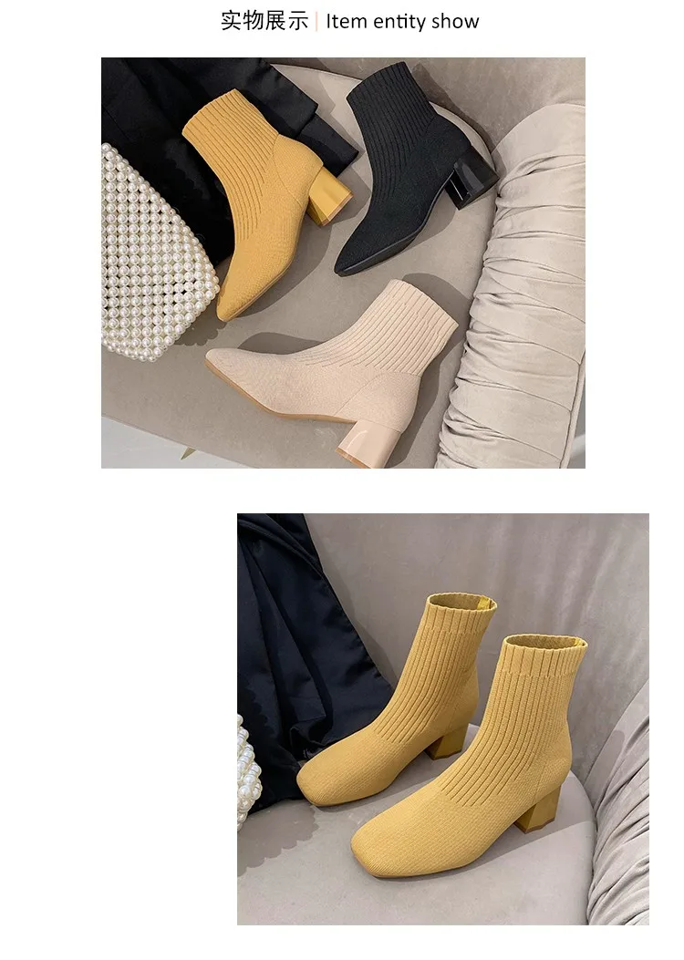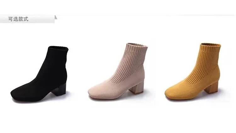 Зимние новые облегающие эластичные женские чулки на высоком каблуке, шерстяные вязаные носки, ботильоны на толстом каблуке, женская обувь