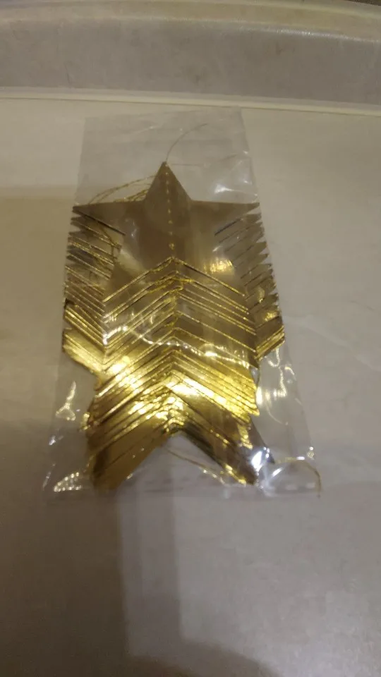 эта гирлянда выглядит как одна целая нить, примерно метра 2 длинна. я ее разрезала на несколько частей и вешала как на фото. сделана из картона. элементы не крупные как может показаться на первый взгляд.