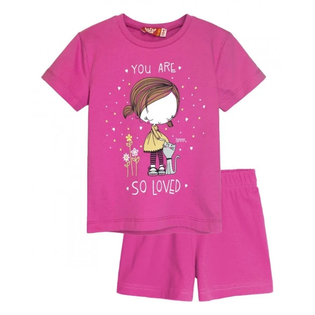 Футболка прямого силуэта, с втачным коротким рукавом. Горловина обработана воротником из кулирки. На полочке принт шелкография. Шорты прямого силуэта. Пояс цельнокроенный с эластичной тесьмой внутри.Полотно: кулирная гладь.Состав: 100% хлопок.