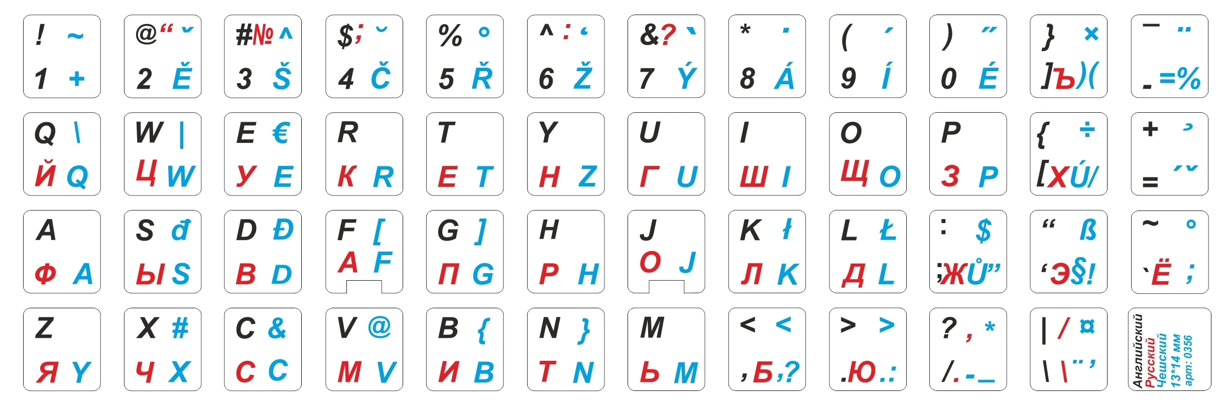 Размер наклейки на одну клавишу 13x14 мм.