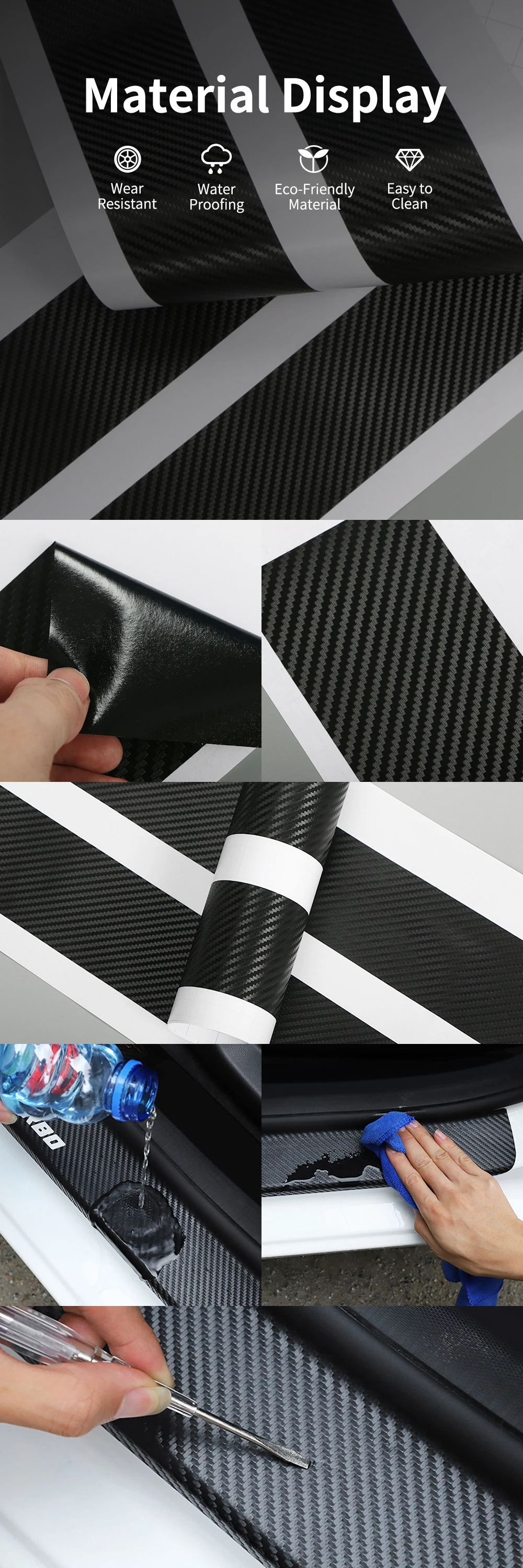 Характеристика:Материал: углеродное волокноИзготовлен из высококачественного материала, наклейка долговечна и долговечна.Идеально подходит для украшения автомобильной двериМожет эффективно защитить край внешней порога пластины, поглощает удары и предотвращает появление царапин.Размер:Входная дверь: 48 см * 6,8 см Reardoor:24 см * 6,8 см, пожалуйста, подтвердите, что размер подходит для вашего автомобиля или нетСоветы по установке:1. Убедитесь, что поверхность, на которую наносится продукт, чистая, сухая и не содержит пыли, жира и воска.2. Определение точного местоположения продукта3. Снимите защитную пленку с клея, тщательно выровняйте, а затем плотно нажмите, чтобы обеспечить правильное сцепление4. Не перемещайте изделие или не мойте машину в течение 24 часов после установкиПосылка:4 шт. наклейки в комплекте (включая 2 шт. Крышка для передней двери, 2 шт. крышка для задней двери)Обратите внимание:Если есть какие-либо проблемы, когда вы получаете посылка, пожалуйста, свяжитесь с нами, прежде чем оставить какие-либо отзывы. Мы решим его для вас терпеливо.