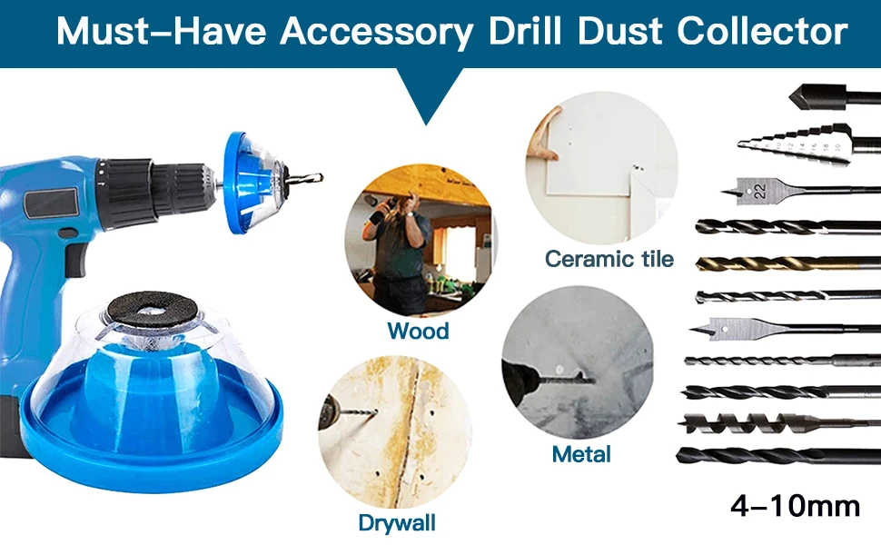 Инструмент для сбора пыли: чтобы не закрывать пол или мебель, попробуйте эту универсальную насадку для сверла. Это удобное устройство подходит для сверл и улавливает пыль, образуемую из сверления отверстий в гипсокартоне, дереве, металле, бетоне и других материалах.