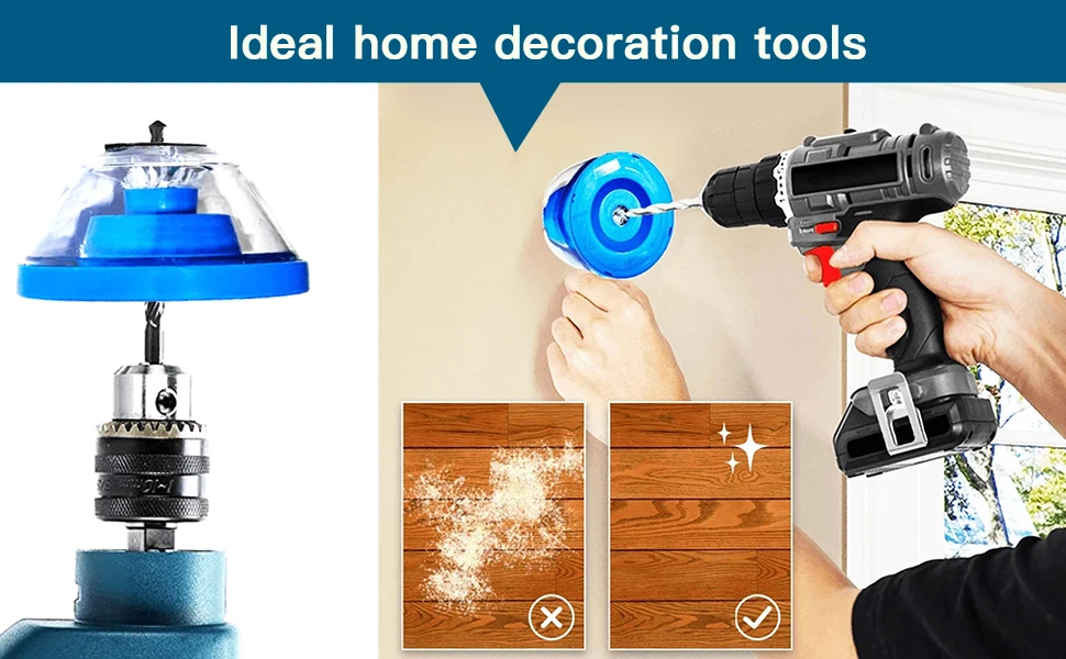 С нашей системой крышки сверла, вы можете сдержать пыль и мусор для чистого рабочего пространства. Насадка для дрели изготовлена из прочного пластика. Он оснащен полой камерой, которая собирает пыль и мусор, когда вы просверливаете каждое отверстие.